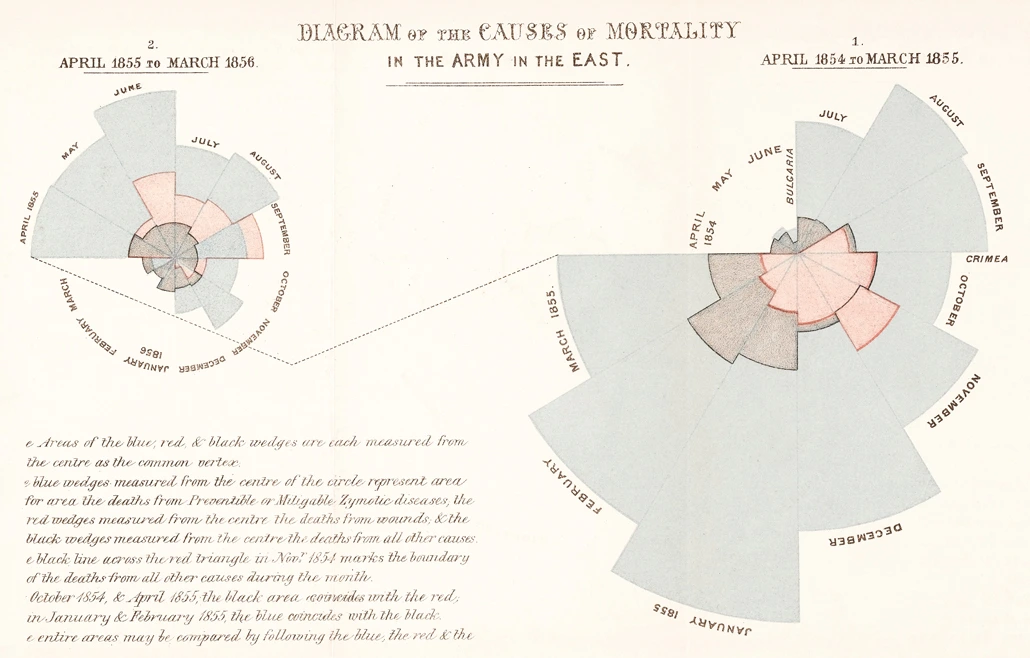 나이팅게일은 1850년대에 발발한 크림전쟁에서 아픈 병사들을 돌보았습니다. 그러던 중 병사들이 놓여있는 열악하고 비위생적인 환경이 사망과 연관되어 있음을 깨닫고 동료들과 함께 병사들의 사망 원인을 기록하기 시작했습니다. 이 데이터를 바탕으로 병사들의 사망자 수와 그 원인을 보여주는 다음의 시각화가 만들어졌습니다.