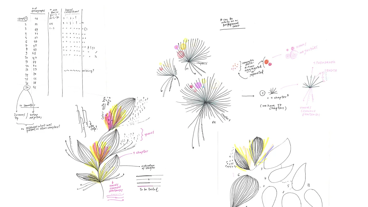 Giorgia Lupi는 '침묵의 봄' 저서를 시각화하였다. 각 챕터 별로, 문단의 길이, 사용된 단어의 수 등을 바탕으로 라인의 길이나 방향성 등의 패턴을 아래와 같이 만들었다. 자주 사용되는 단어들을 선정하고, 이 단어별로 색깔을 부여했다. 즉, 각 챕터별로 어떤 단어들이 많이 사용되었는지 색의 패턴을 통해 확인할 수 있다. 책의 이야기가 데이터 시각화가 된 것이다.