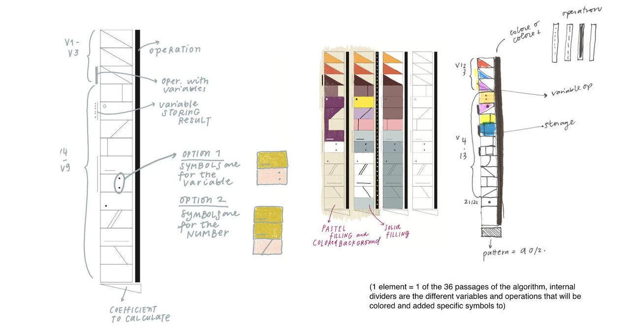 Giorgia Lupi는 이 알고리즘의 수학적 구조를 분석하여, 다양한 색채의 기하학적 패턴으로 시각화하였다. 그게 바로 위에 보이는 옷이다. 아래는 그 과정의 일부를 보여준다. 알고리즘을 각각의 단위로 나누고, 단위 별로의 역할 (저장, 실행 등), 변수, 결과 값 등의 수학적 구조를 색깔, 부호, 기하학 모형 등으로 변환시켰다. 자세한 과정이 공개되지는 않았지만, 수학적 알고리즘이 이렇게 아름다운 옷의 패턴으로 만들어질 수 있다는 사실이 놀랍다.