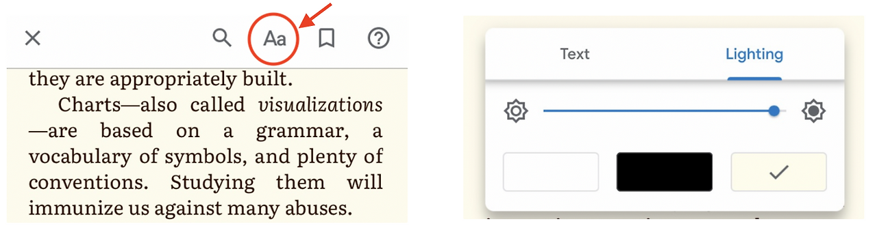 제가 제일 좋아하는 기능 중에 하나인데요. 가독성을 높이기 위해 페이지의 디자인을 다음과 같이 선택할 수 있습니다. Aa라는 아이콘을 누르면 오른쪽과 같이 Text와 Lighting을 조절하는 창이 뜹니다. 개인적으로는 살짝 누런색 바탕에서 책이 편안하게 잘 읽히는 것 같아요.