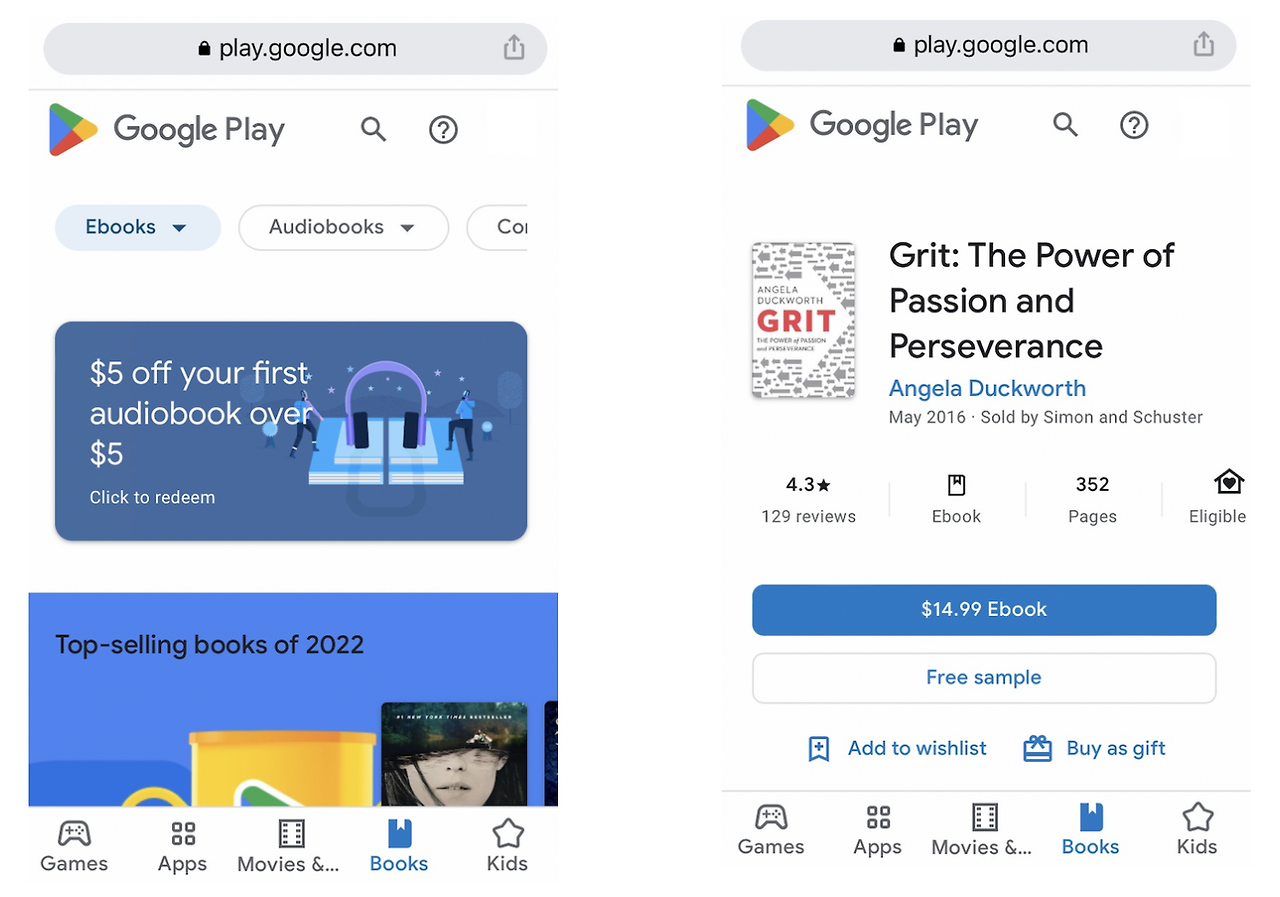 ‘Play Books’ 앱에서 책을 읽으려면 먼저 책을 주문해야 하겠죠. 이때 책은 앱에서는 구매가 되지 않습니다. 아래와 같이 ‘Play Books’의 웹사이트(https://play.google.com/store/books)를 가서 맨 위의 돋보기 아이콘을 눌러 원하는 책을 검색 후 구매한 후에, 앱에서 책을 읽을 수가 있습니다.