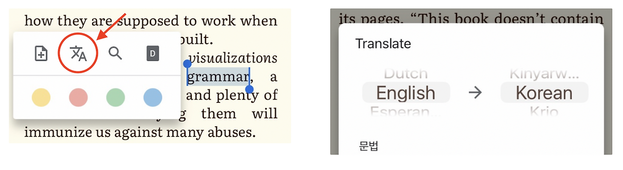 아래와 같이 단어나 문장을 선택을 하면 여러 기능이 포함된 창이 하나 뜹니다. 이때 왼쪽에서 두 번째 아이콘을 선택하면 오른쪽과 같이 구글 번역이 된 해석이 바로 나옵니다. 저는 이 기능을 아주 애용합니다. 예전처럼 따로 구글 번역 창을 열어서 창을 옮겨가며 책을 읽을 필요가 없게 되었어요.