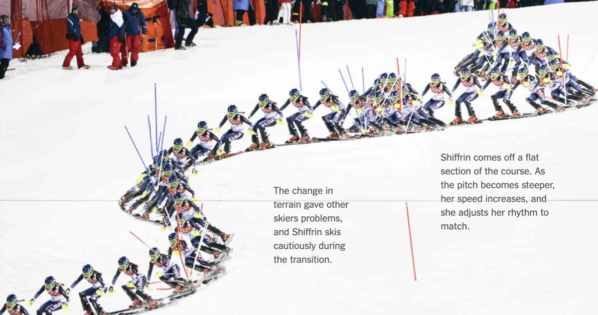 뉴욕타임즈는 2014년 소치 올림픽에서 미카엘라 쉬프린(Mikaela Shiffrin)이 스키대회를 어떻게 우승했는지 분석하는 기사를 내보냈습니다. 스키와 같은 종목은 워낙 그 순간이 빠르게 지나가기 때문에 선수의 움직임을 자세히 따라가기가 쉽지 않습니다. 뉴욕타임즈는 실시간으로 이 움직임들을 포착해서 한번에 보여주는 합성된 이미지를 위와 같이 만들었습니다. 미카엘라가 어디에서 어떻게 방향 전환을 했는지, 그 때 어떤 동작을 취했는지 등을 알수있고 속도감 또한 느껴집니다. 이렇게 합성된 긴 이미지를 아래로 스크롤하면서 보면, 그녀와 함께 산을 내려가는 듯한 경험도 제공하게 됩니다.
