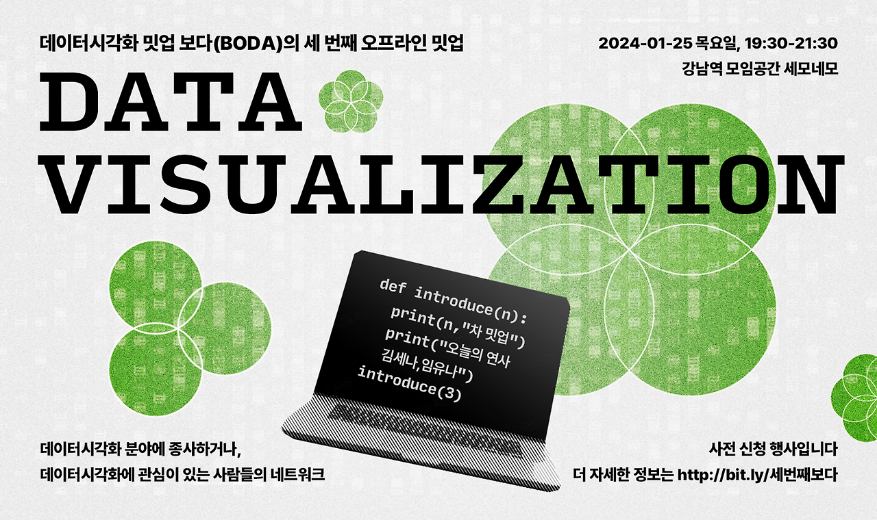 안녕하세요, 데이터 시각화 밋업 ‘보다(BODA)’를 소개합니다. ‘보다(BODA)’는 데이터 시각화 분야에 종사하거나, 데이터 시각화에 관심이 있는 사람들의 네트워크를 위해 2022년 여름에 결성된 밋업입니다.