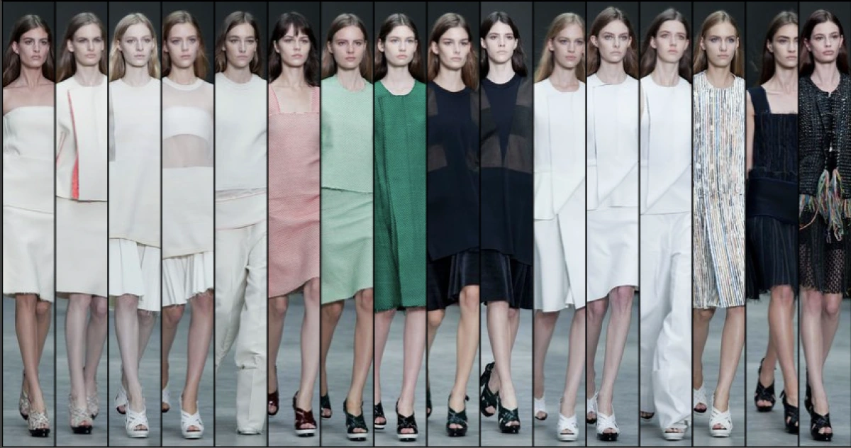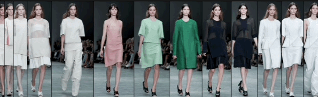처음 보이는 컬렉션은 캘빈클라인입니다. 컬렉션에 나왔던 모든 의상을 한눈에 확인할 수 있도록, 각 의상을 긴 막대 형태로 편집하여 하나의 모음으로 만들어줍니다. 이렇게 보니 컬렉션의 전체적인 패턴이 쉽게 인식됩니다. 개인적으로는 깔끔하다는 인상을 받았습니다. 하나의 의상에 많은 색을 사용하지 않았고, 전반적으로 패턴의 사용이 제한적인 것 같습니다.
