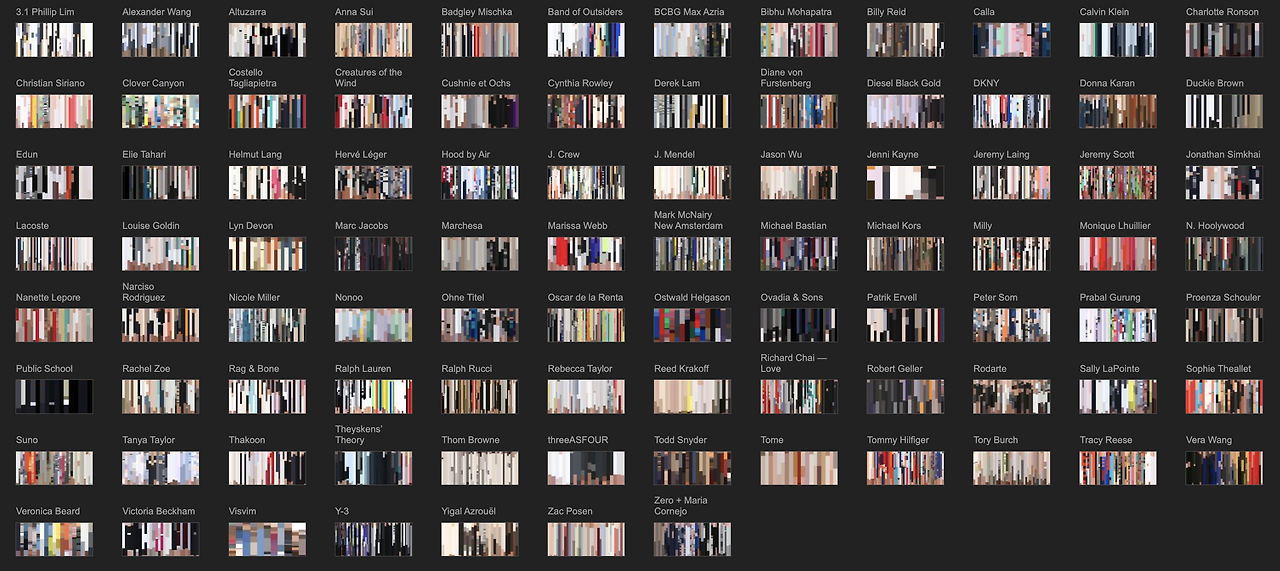 이번에 소개할 데이터 시각화는 사진을 이용한 시각화입니다. 사진이 담은 색감과 패턴이 데이터가 된 경우인데요. 뉴욕타임스는 2013년 보도를 통해 당시 뉴욕의 패션위크를 다음과 같이 시각화하였습니다.