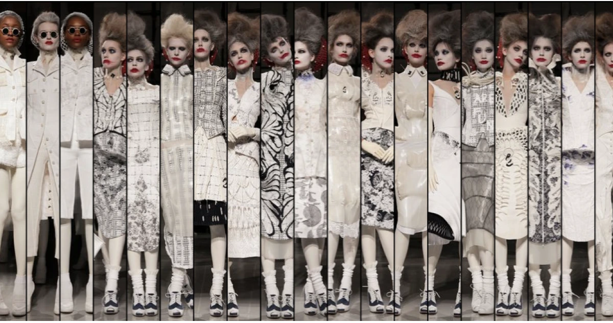 다음은 톰 브라운의 컬렉션 사진입니다. 캘빈클라인과 어떻게 다른 것 같나요? 우선 파격적인 헤어스타일과 메이크업이 눈에 띄네요. 의상에서는 검은색과 흰색 등의 무채색 외에는 색이 거의 쓰이지 않은 것을 알 수 있습니다. 대신 옷의 모양이 보다 입체적이고, 굉장히 다양한 패턴이 보입니다. 이렇게 각 컬렉션의 의상을 한눈에 볼 수 도록 함으로써, 컬렉션을 대표하는 분위기나 색, 디자인등의 패턴을 쉽게 파악할 수 있습니다.