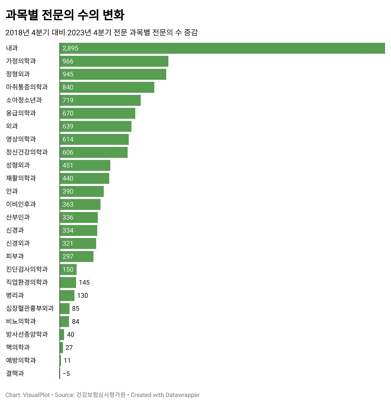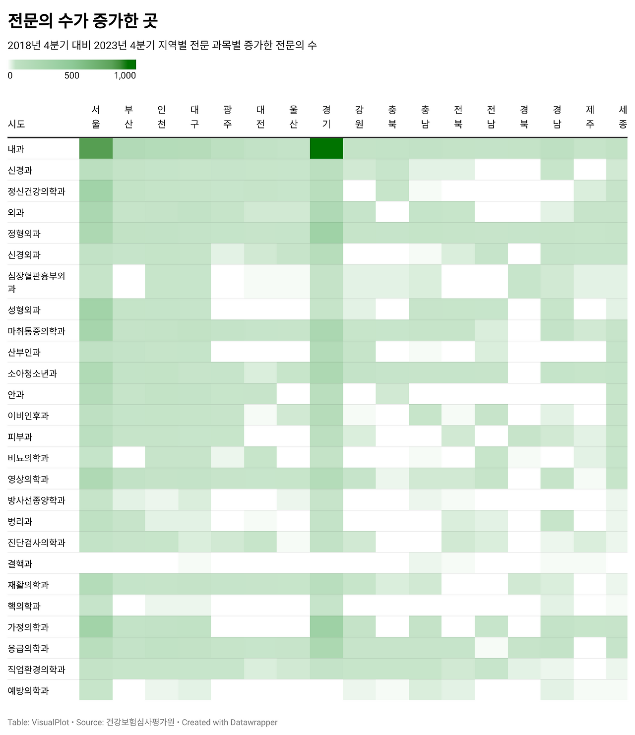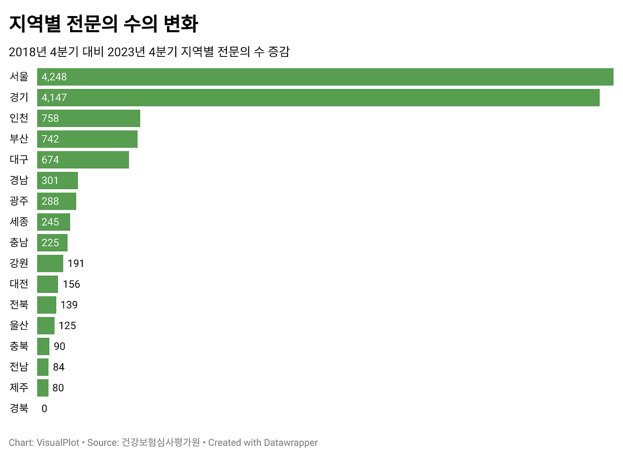 건강보험심사평가원에서 제공하는 '지역별 종별 전문과목별 전문의수' 데이터를 발견했습니다. 분기별로 데이터가 제공되었는데요, 데이터 중 가장 최근인 2023년 4분기와 가장 오래된 2018년 4분기의 데이터를 비교해 보기로 했습니다. 아래의 시각화는 제공된 데이터를 가공하여 분석 후 만들어진 시각화입니다.