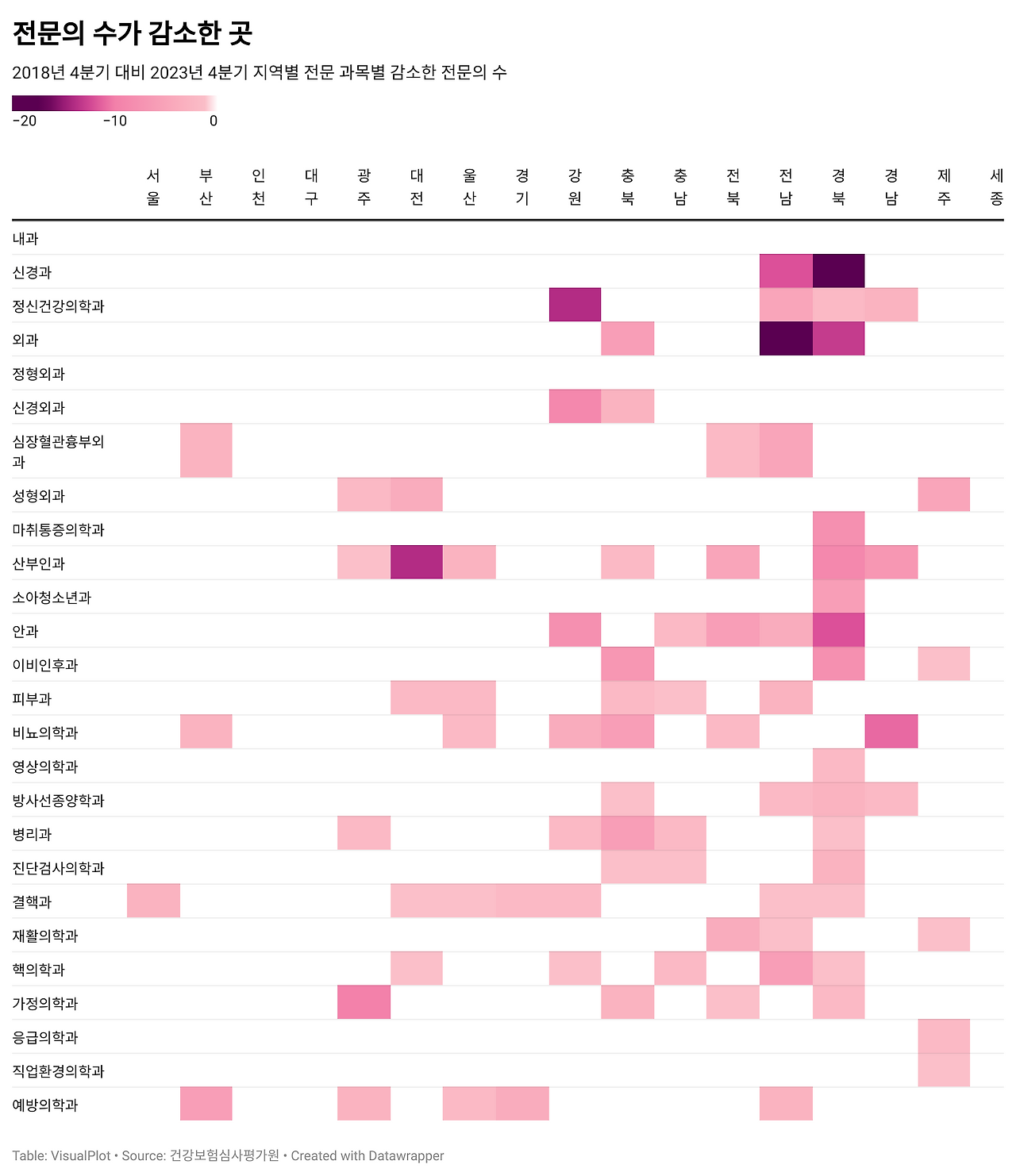 다음은 2023년 4분기의 전문의 수가 2018년 4분기 대비 감소한 곳을 보여줍니다. 지역적인 격차가 보입니다. 눈에 띄는 것은 전남, 경북지역입니다. 굉장히 많은 분야에서 전문의 수가 감소하였습니다. 특히 외과와 신경과의 감소세가 큽니다.