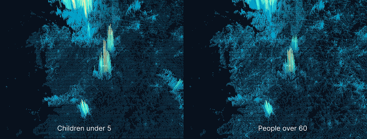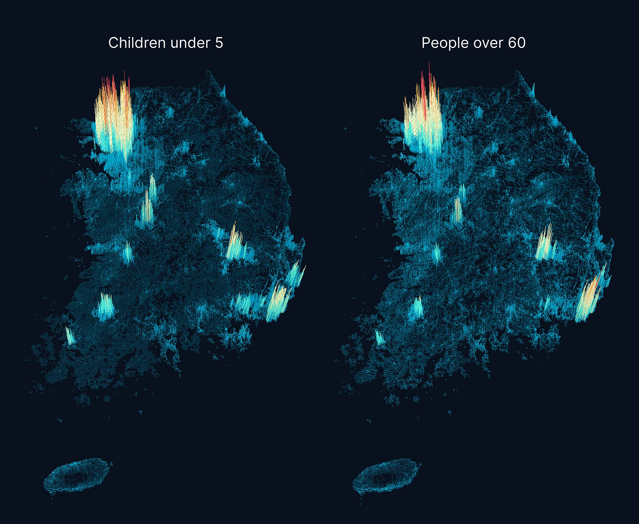 최근 한국의 인구 구조 변화에 대한 관심이 높아지고 있습니다. 이 글에서는 5세 이하 어린이와 60세 이상 고령 인구의 분포를 인구 밀도 지도를 통해 비교해 보겠습니다. 분석에는 2019년 고해상도 데이터를 사용하였습니다.