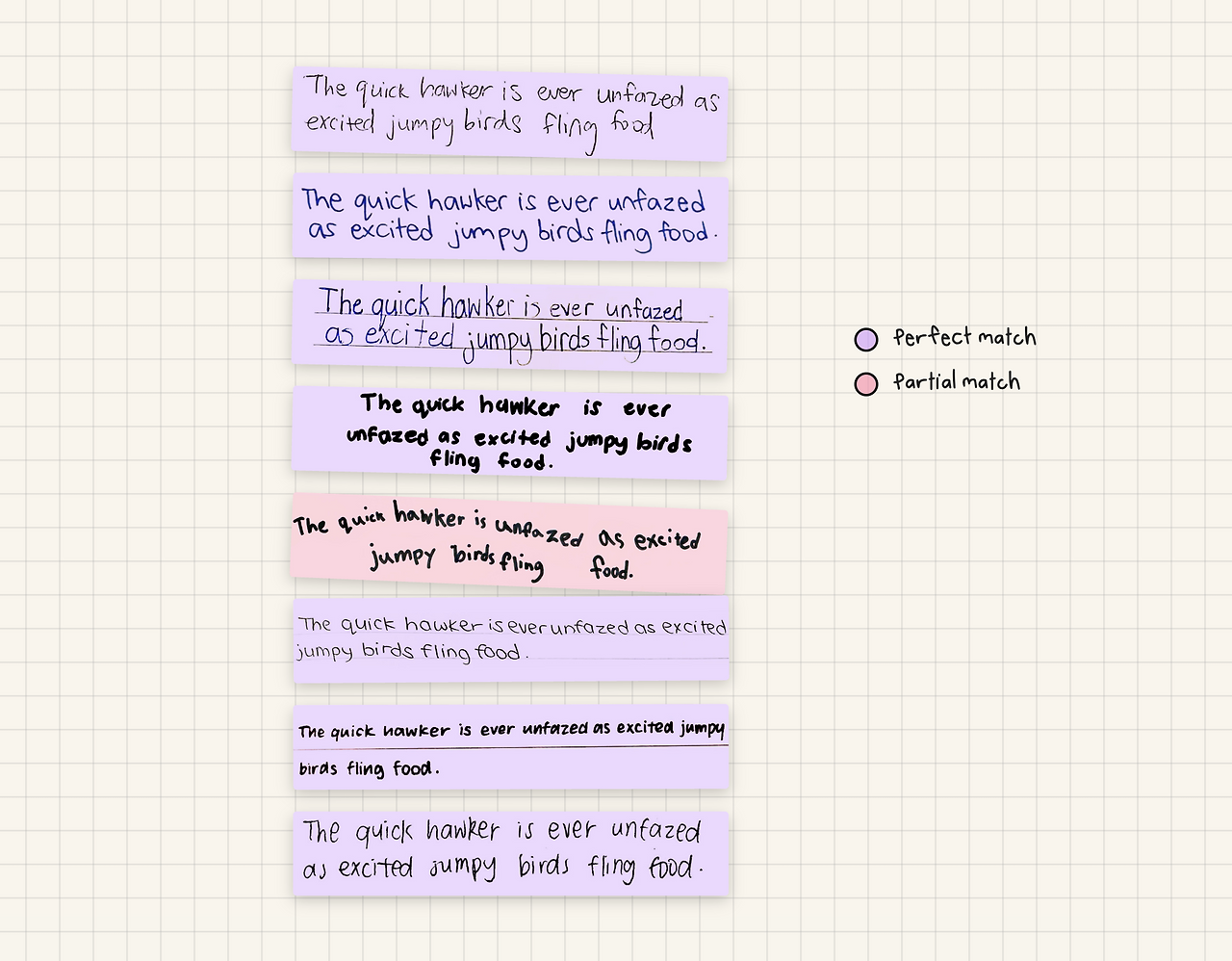 OCR(Optical Character Recognition)은 사진이나 이미지 속 글자들을 진짜 텍스트로 바꾸어주는 기술을 말하는데요. OCR을 이용해서 버블체의 글씨를 인식했을때, 그 정확도가 아래와 같이 높았습니다. 대부분 Perfect match 인 것을 확인할 수 있습니다.