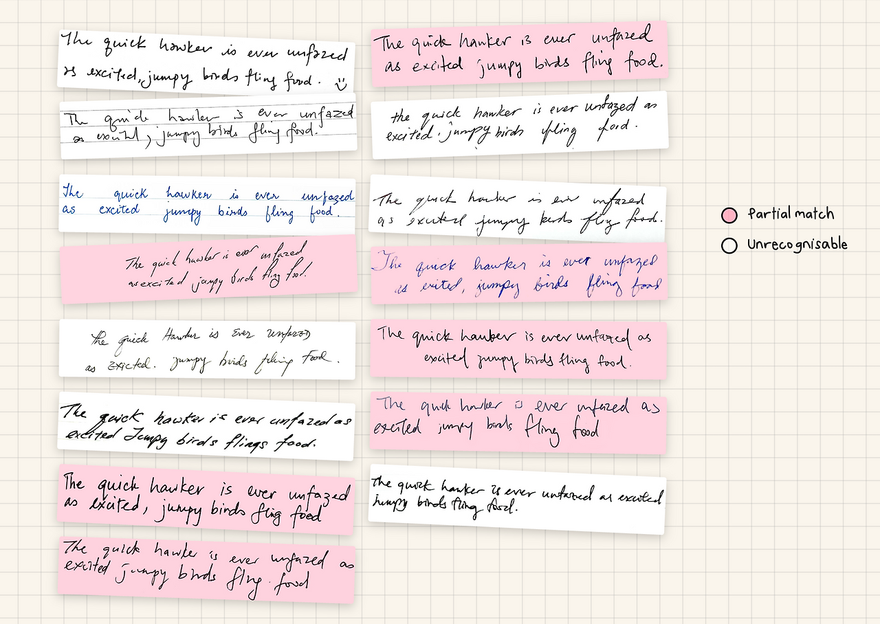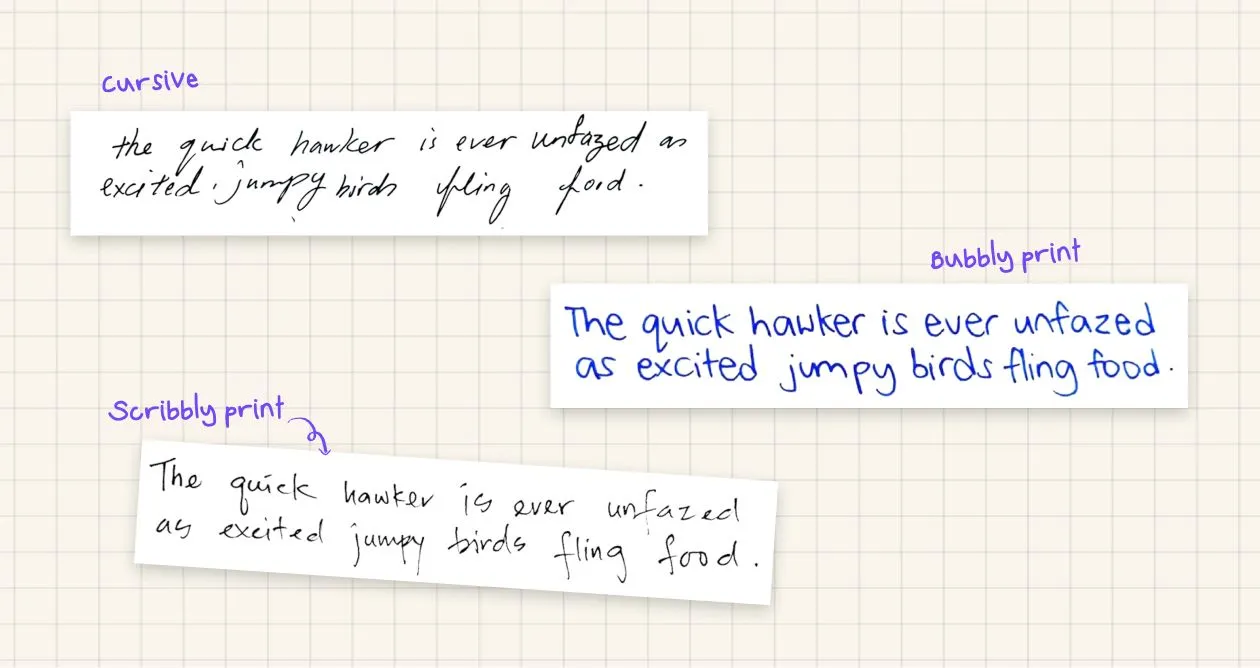 머신러닝을 이용하여 각 알파벳을 쓰는 특성을 분석한 결과, 3개의 대표적인 손글씨 스타일을 발견할 수 있었습니다. 크게는 필기체(Cursive)와 인쇄체(Print)로 나뉘고, 인쇄체는 휘갈겨 쓴 듯한 모양의 낙서체(Scribbly print)와 둥글둥글한 형태의 버블체(Bubbly print)로 구분되었습니다.