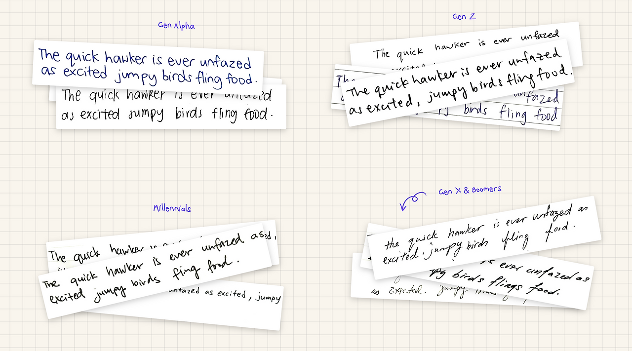 재미있는 사실은 버블체(Bubbly print)는 그 모양에서 유추할 수 있듯이 대부분 GenZ 혹은 Gen Alpha가 사용하는 스타일이었고, 필기체(Cursive)는 Gen X 혹은 Boomer가 주로 사용하는 것을 알 수 있었습니다.