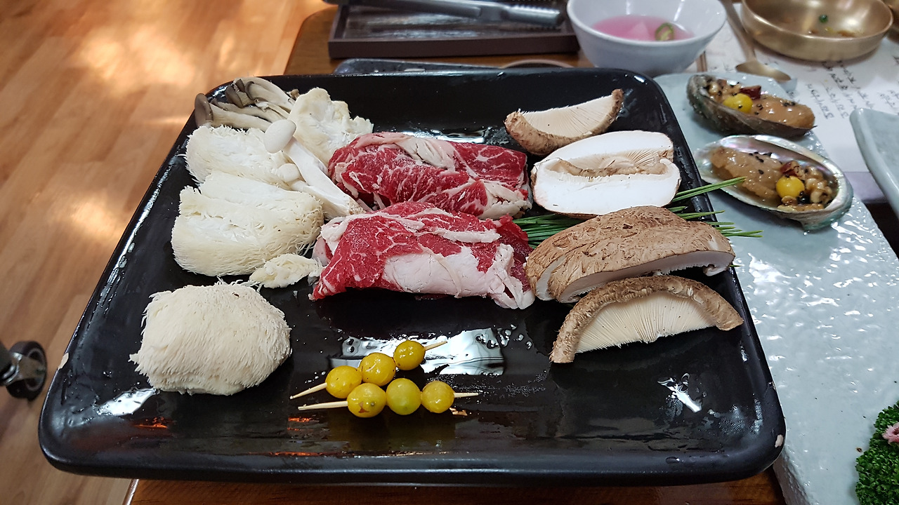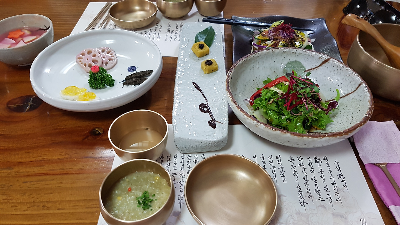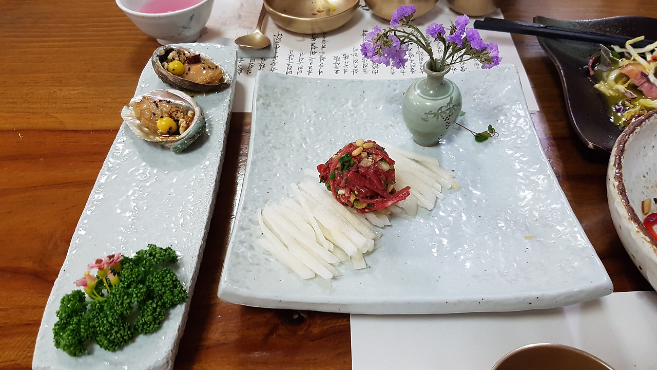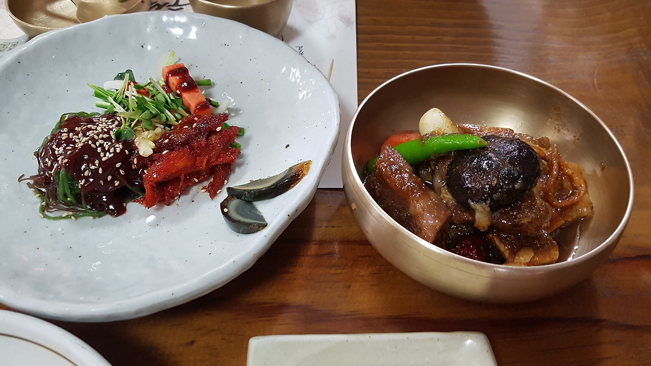 연근, 마, 우엉이 두 편씩 준비된 독특한 에피타이저가 입맛을 사로잡기 시작해 맛깔난 떡갈비, 갈비찜 등을 지나 마지막 식사로 서브된 비빔밥까지 아주 괜찮다.