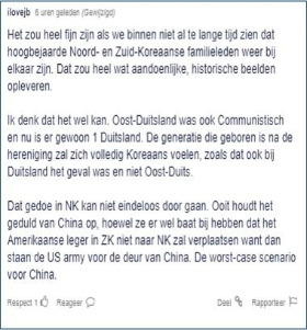 기사가 꽤 많이 나와 있지만, 댓글이 많은 nu.nl의 기사, "북한과 남한, 영구적 평화를 추구하기로 결정하다"에 대한 반응을 살핀다. (NU는 1999년에 생긴 비교적 신생 언론사이다. NOS나 다른 Volkskrant, Trouw는 댓글 기능이 활성화되어 있지 않거나 구독자만 로그인 상태로 읽어볼 수 있다.)