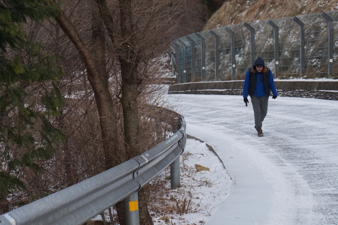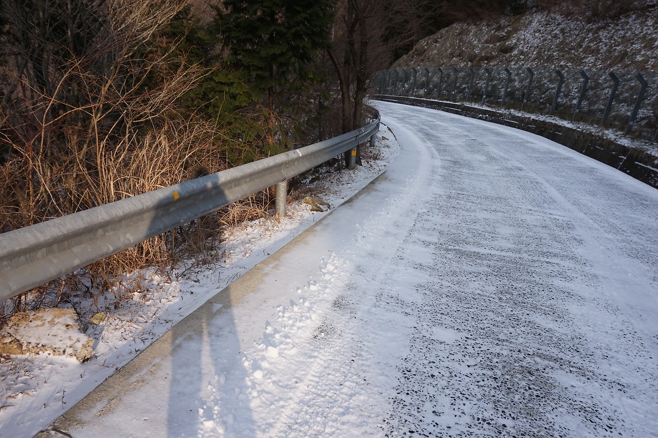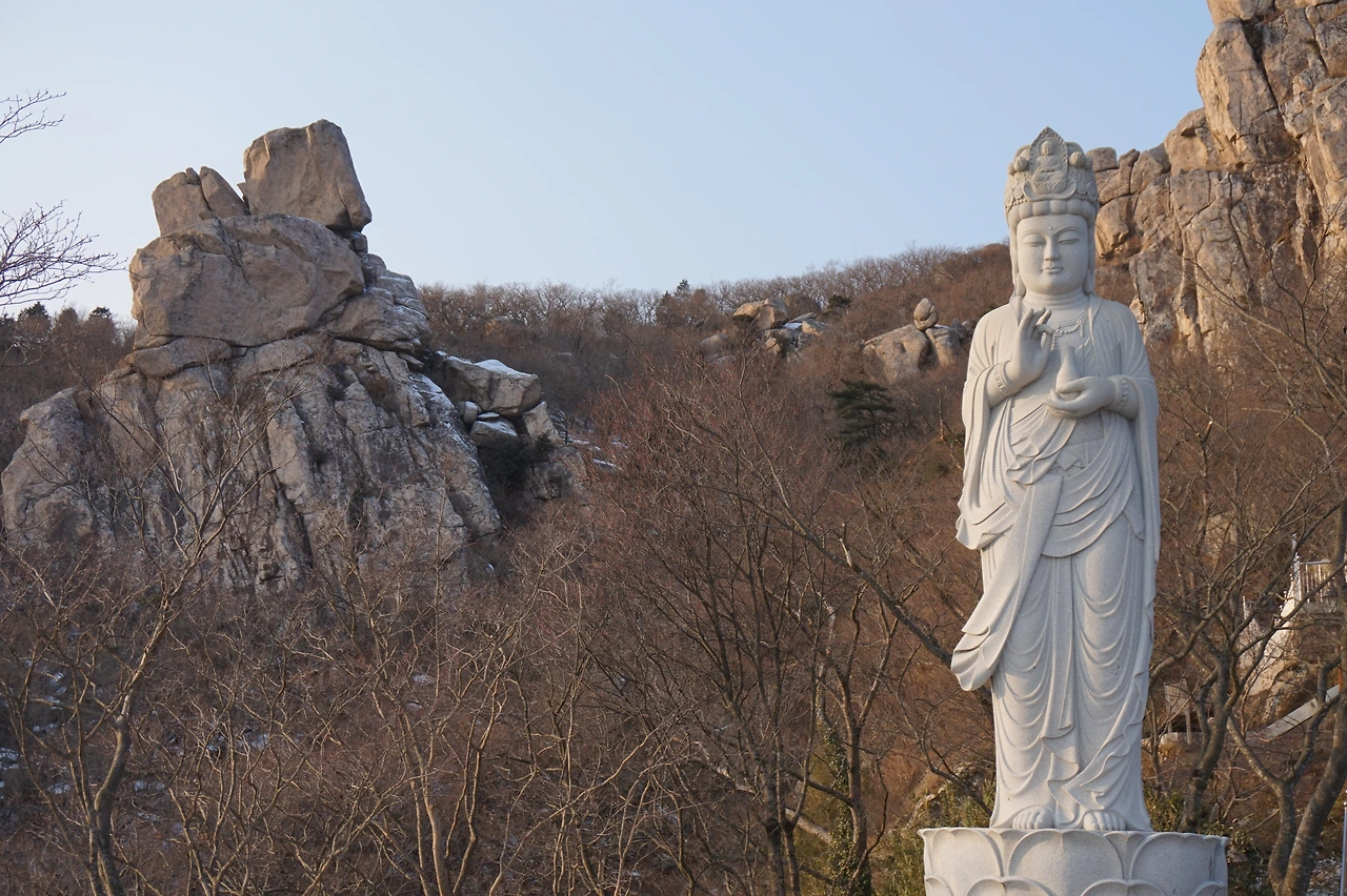 그러나 이번에도 고생길이 기다리고 있었다. 간밤에 내린 눈이 얼어붙어 차량 통행이 금지된 것이었다. 택시는 보리암으로 오르는 길에 접어든 지 몇 분 만에 멈춰 섰다. 우리는 배낭을 짊어지고 얼어붙은 길을 오르기 시작했다. 22도의 업힐이 3km나 이어지는 난코스. 제설차량 운전기사가 우리를 보고는 혀를 차며 지나갔다. 그러나 우리는 포기하지 않았고 한 시간 반을 걸려서 마침내 보리암에 다다랐다. 해발고도는 600m가 조금 넘었나. 우리는 절을 앞에 두고 가져온 캔맥주를 마시며 자축했다. 차량이 통제된 탓인지 보리암에는 인기척이 없었다. 직원들은 모두 제설작업에 나선 듯했다. 우리는 사람이 없는 보리암 이곳저곳을 구경했다. 구름이 끼어 있었지만 날씨는 나쁘지 않았고 보리암에서 내려다보는 남해 바다는 절경이었다.