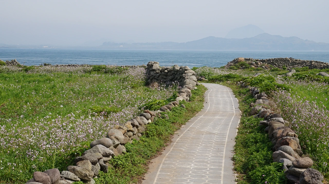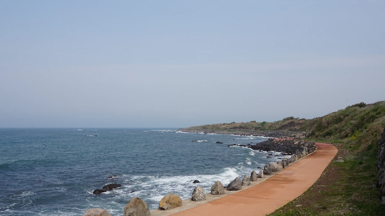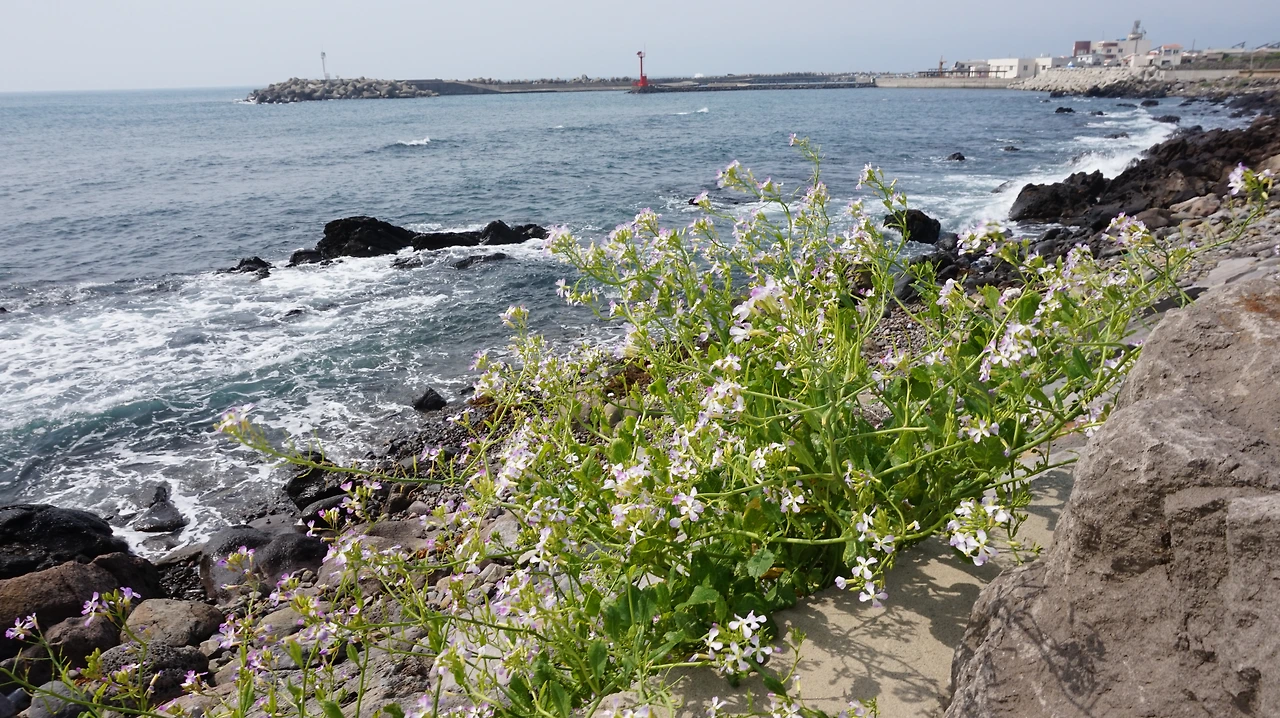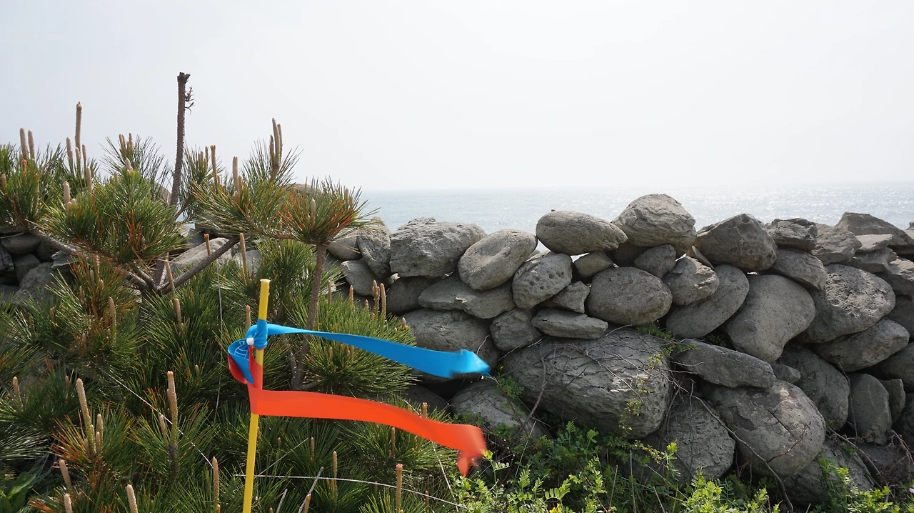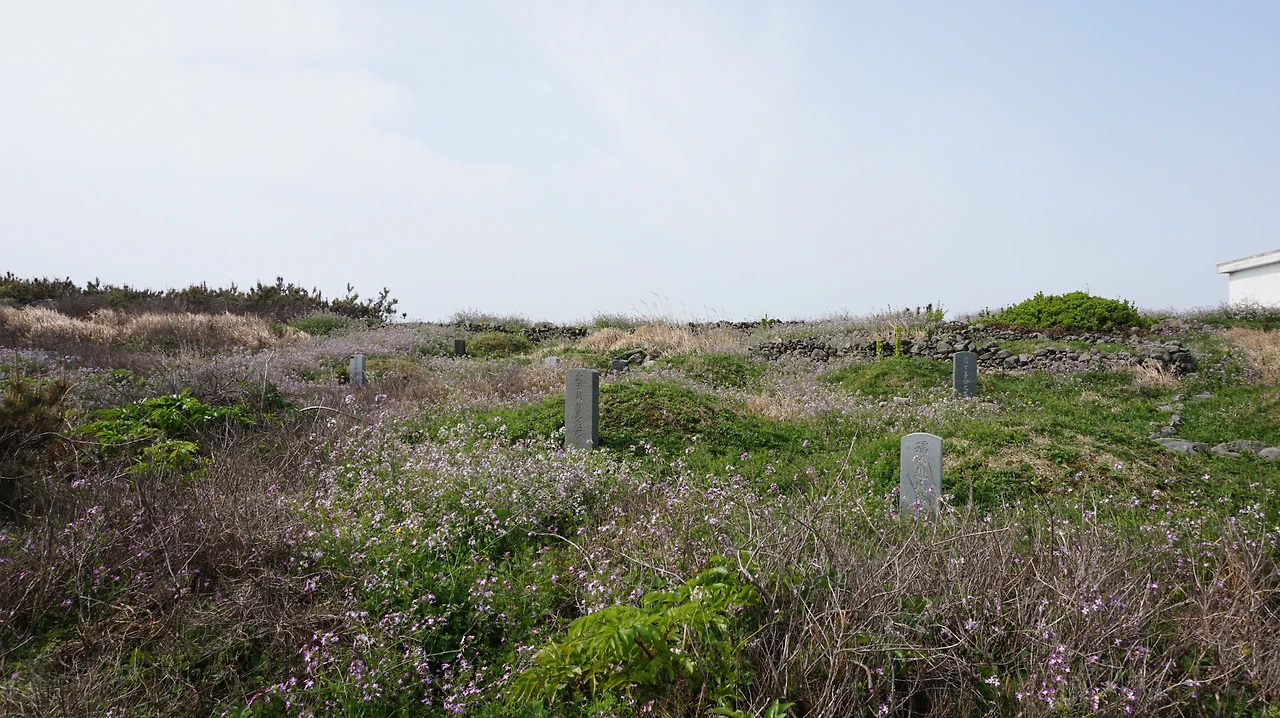 청보리밭을 지나면 다시 섬 동쪽의 해안길이 나온다. 제주도를 등 뒤에 두고 걷게 되는데 이곳의 바다 풍경도 서쪽 못지않게 아름답다. 바닷물이 들어오는 돌 틈에는 이런저런 꽃들이 피어 있었다. 해안길 바로 옆에는 공동묘지가 있었다. 작은 봉분 여러 개가 바다를 바라보며 있었다. 작은 들꽃이 공동묘지 가득 피어 있었다. 세상에서 가장 아름다운 공동묘지였다.