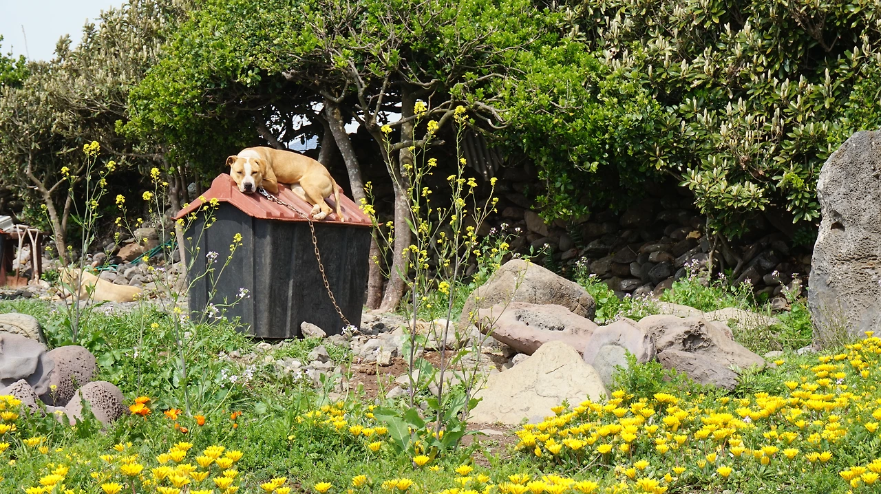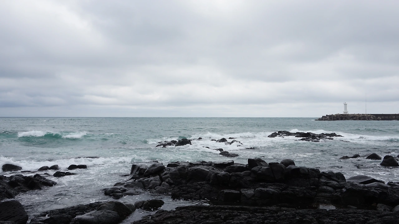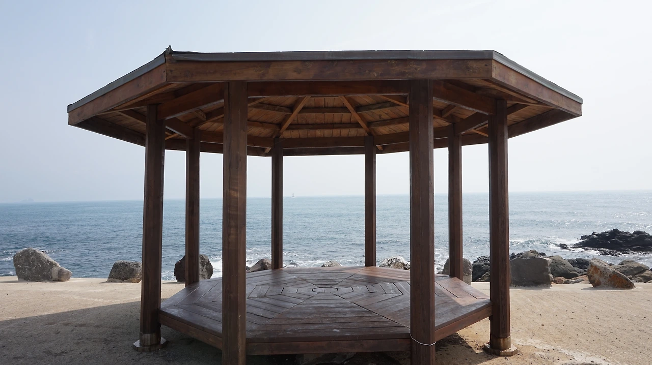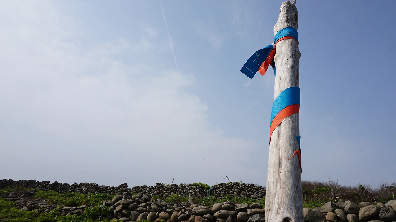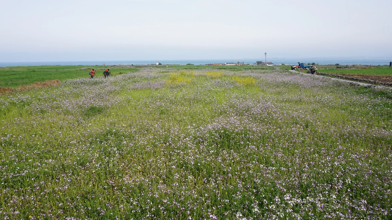 청보리밭을 지나면 다시 섬 동쪽의 해안길이 나온다. 제주도를 등 뒤에 두고 걷게 되는데 이곳의 바다 풍경도 서쪽 못지않게 아름답다. 바닷물이 들어오는 돌 틈에는 이런저런 꽃들이 피어 있었다. 해안길 바로 옆에는 공동묘지가 있었다. 작은 봉분 여러 개가 바다를 바라보며 있었다. 작은 들꽃이 공동묘지 가득 피어 있었다. 세상에서 가장 아름다운 공동묘지였다.