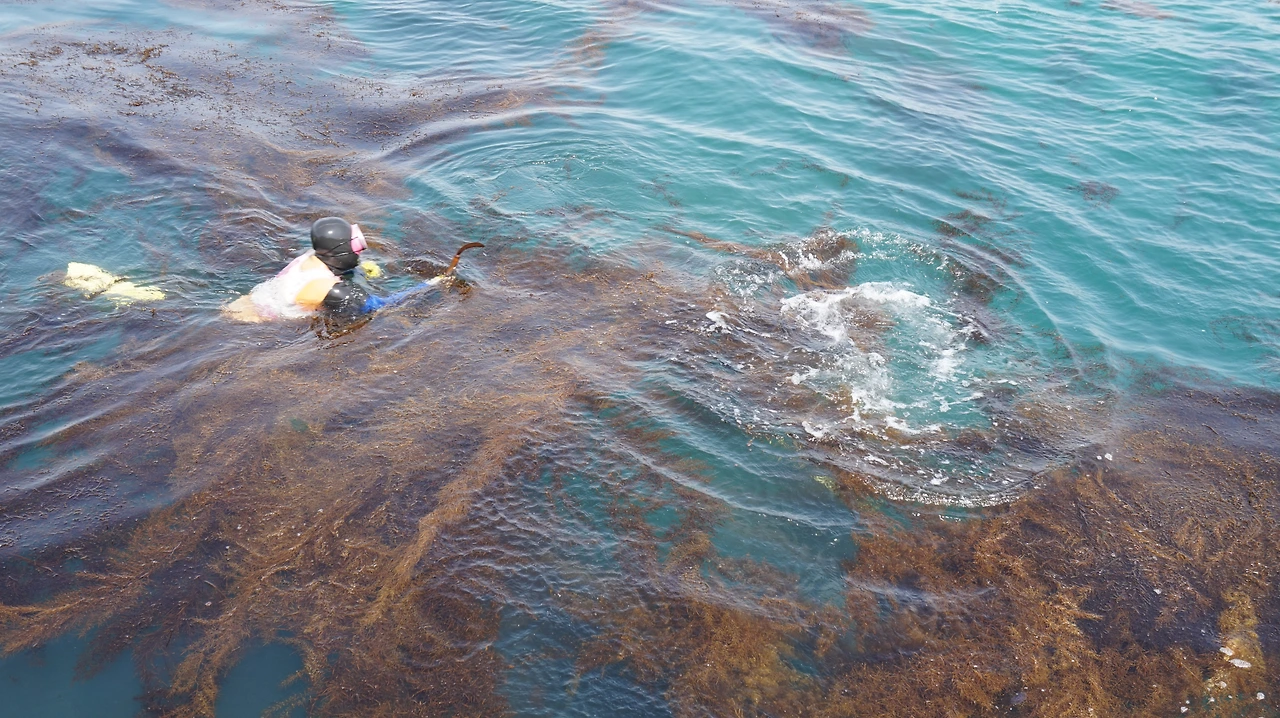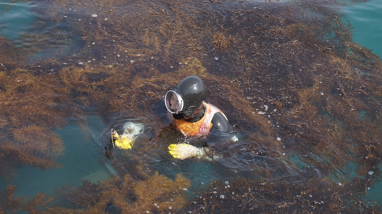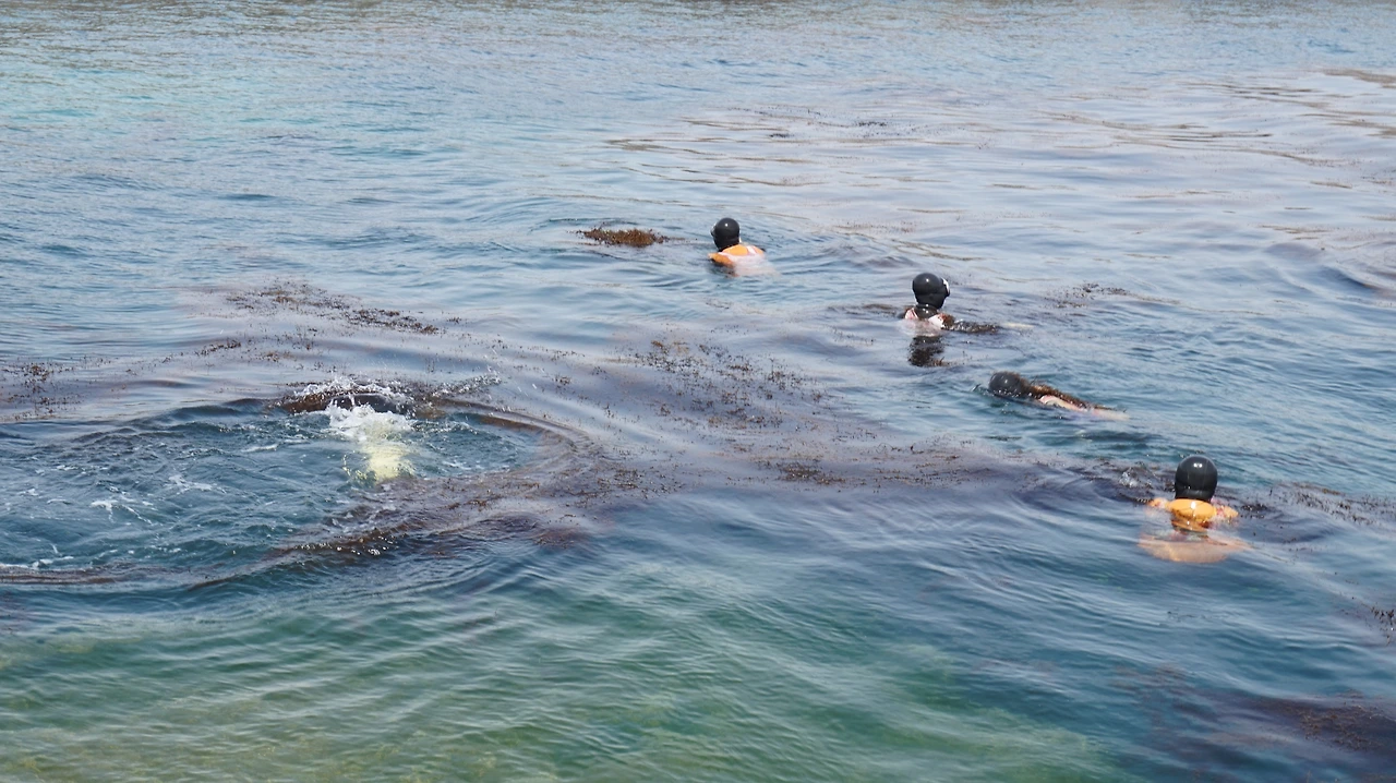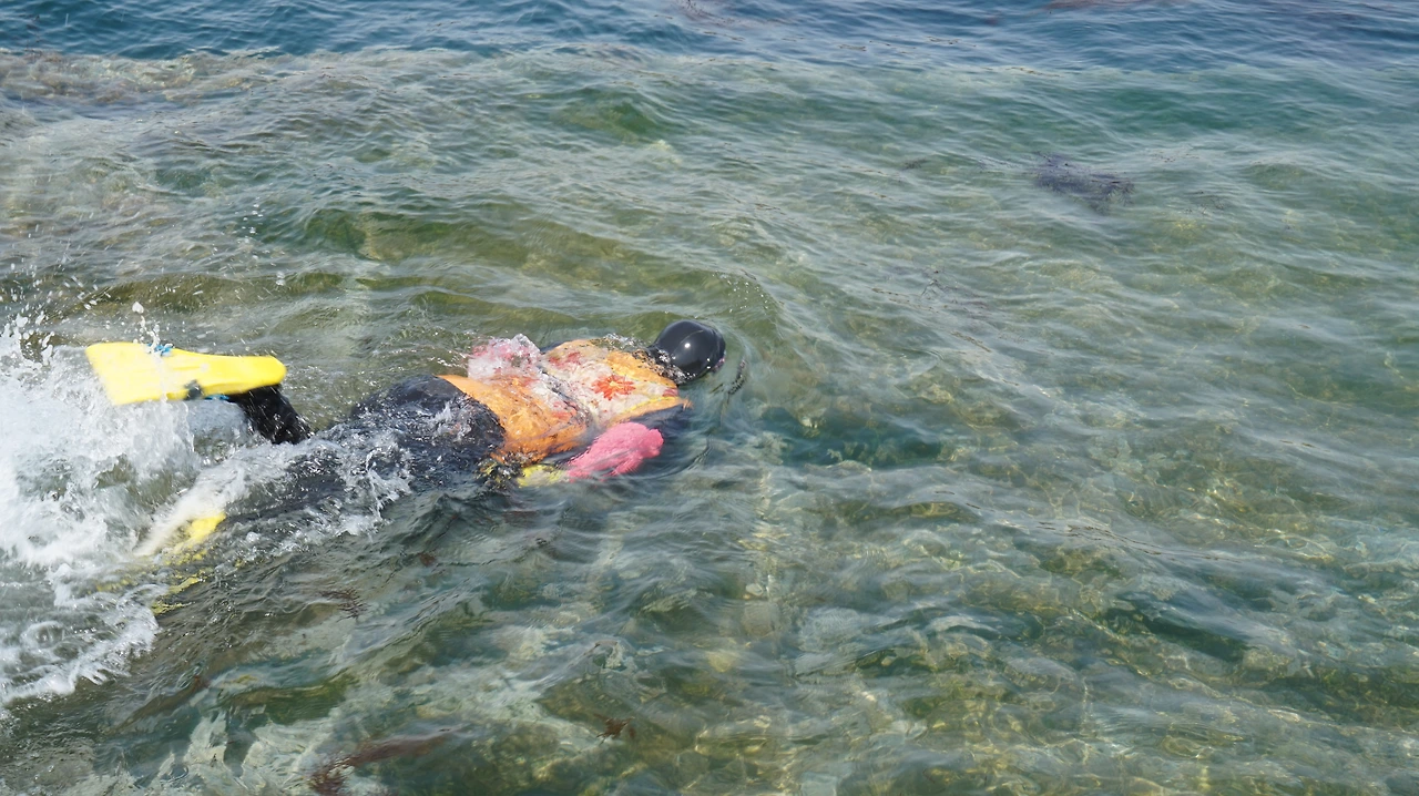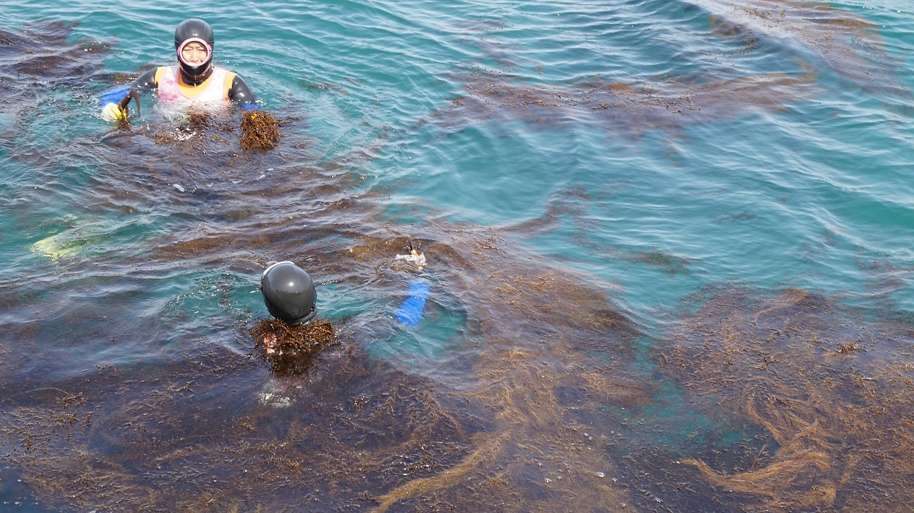 청보리 축제를 하루 앞둔 탓인지 가파도 마을 사람들은 축제 준비에 바쁜 모습이었다. 남자들은 섬 여기저기를 다니며 허수아비를 세우고 있었다. 여자들은 섬 여기저기서 물질을 하고 있었다. 특히나 상동마을에서는 수십 명의 잠녀(해녀)들이 모여 톳과 미역을 채취하고 있었다. 잠녀들은 두 명씩 짝을 이뤄 바다 안으로 들어갔다. 잠녀들의 작업 모습을 TV가 아닌 실제로 본 것은 이번이 처음이었다. 방파제에 서서 잠녀들이 어떻게 움직이는지 유심히 관찰했다. 특히나 숨비 소리가 인상적이었다. 물에서 나올 때마다 '퓌히'하는 소리가 항구 가득 울려 퍼졌다. 지금도 가파도 여자의 절반 정도가 잠녀로 일하고 있다고 한다.