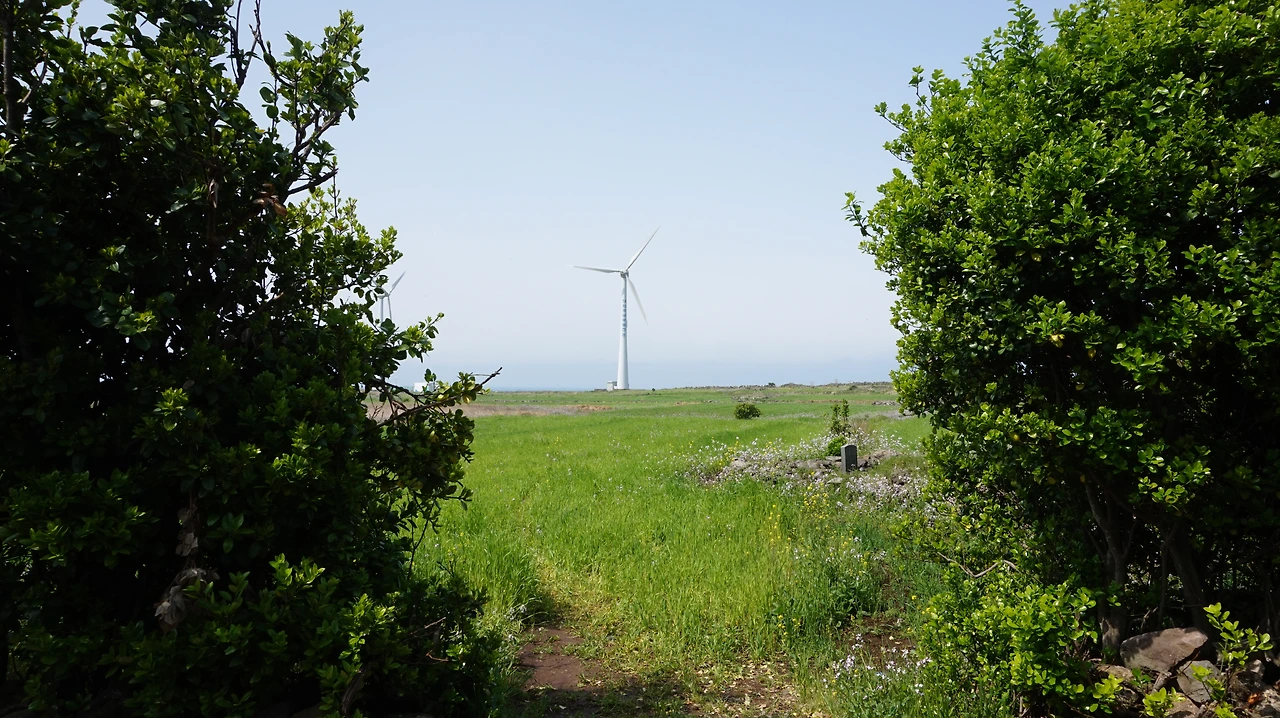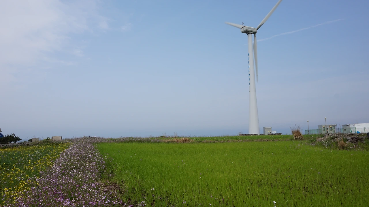 가파도는 섬 전체를 걸어서 둘러보는데 2시간이면 충분하다. 배에서 내리자마자 서쪽 방향의 해안길로 걷기 시작했다. 가파도 올레길은 해안길을 따라가다 섬 안의 청보리밭으로 이어지고 다시 반대편 해안길로 빠져나가는 방식으로 만들어져 있다. 해안길은 바다와 청보리밭 사이로 이어져 있는데 양쪽 모두 아름다운 풍경이 계속되기 때문에 어디에 눈을 둬야 할지 고민이었다. 콘크리트 벽에 부딪혀 부서지는 파도를 바라보는 재미도 일품이고, 청보리밭 사이에 우뚝 솟은 풍력발전기가 돌아가는 것을 보는 재미도 그에 못지않다. 해안길에 만들어진 정자에서 잠깐씩 쉬어가며 걷다 보며 갈림길이 나온다. 여기서 청보리밭으로 향한다.