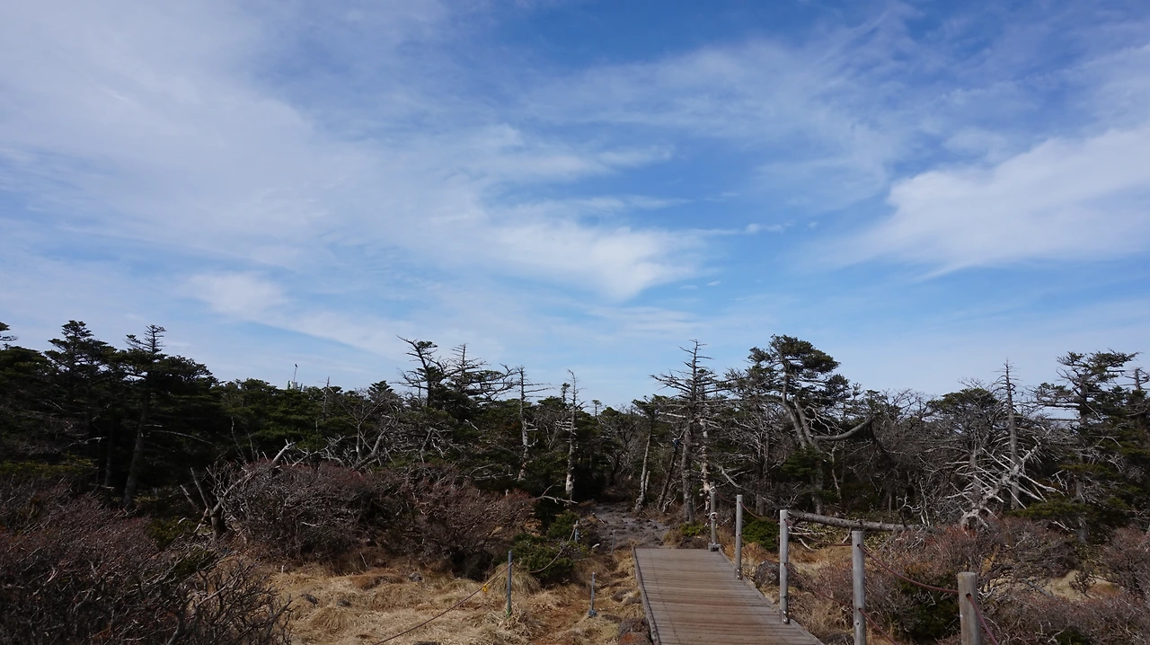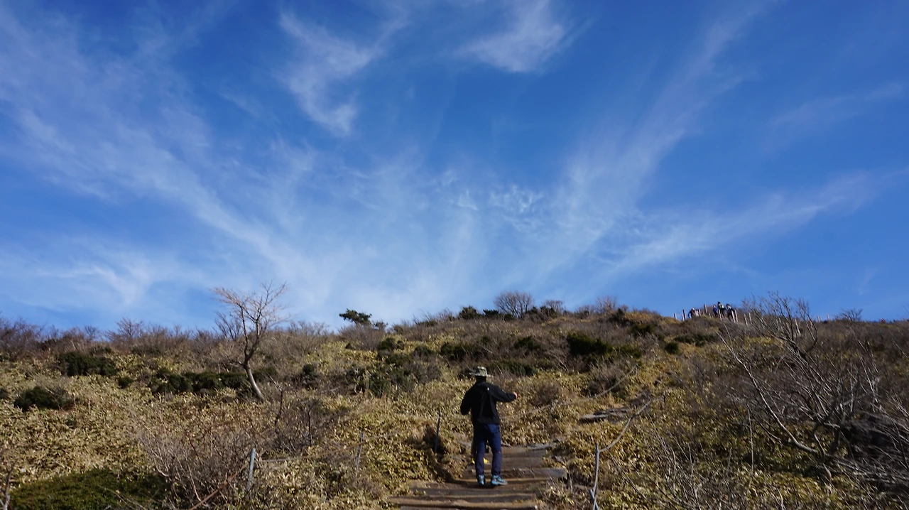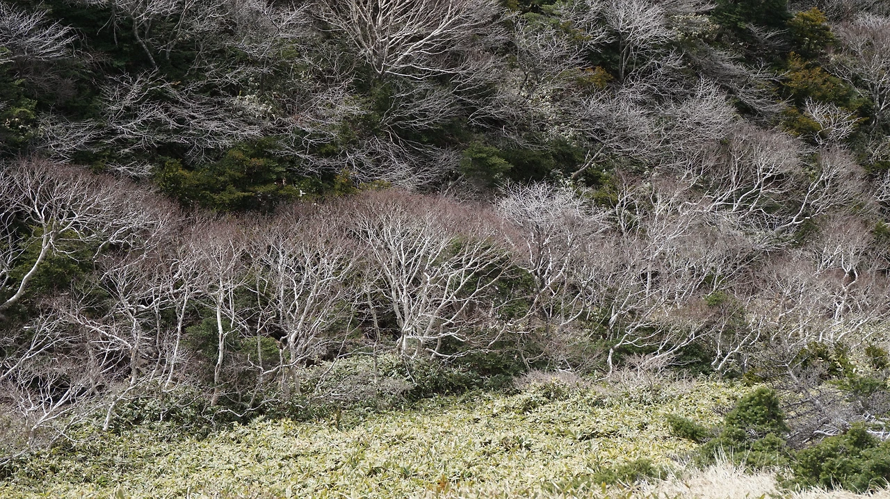 영실코스의 장점은 여기에 있다. 산 쪽을 보면 병풍바위를 비롯한 영실기암의 어마어마한 위용에 감탄하고, 고개를 돌려 바다 쪽을 보면 망망대해에 시선을 뺏기게 된다. 등산로를 맴도는 까마귀의 울음소리까지 더해져 그야말로 환상적인 풍경이다. 마음을 편하게 먹고 중간중간 쉬면서 계단 코스를 오르다 보면 구상나무 숲이 나온다. 구상나무들은 이파리가 하나도 없는 채로 하얗게 벌거벗은 모습이었는데 대부분 고사한 것이 아닌가 싶었다. 뉴스에서 국내 침엽수가 집단 고사한다는 소식을 본 적이 있었다. 아쉬운 마음을 뒤로 하고 계속 걷다 보면 나무들이 사라지고 갑자기 거대한 평야가 나타난다. 한라산 선작지왓이다.