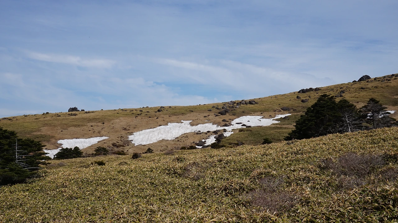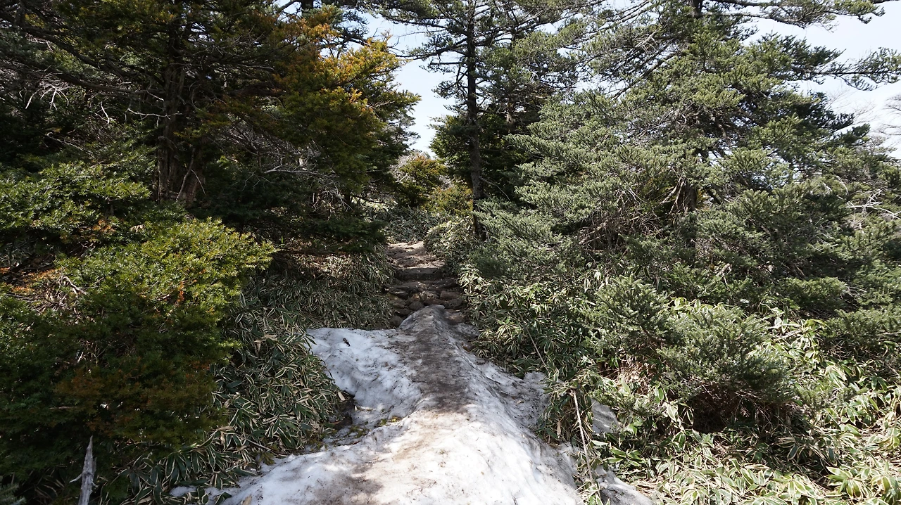 4월의 한라산에는 채 녹지 않은 눈이 곳곳에 있었다. 윗세오름까지는 눈을 볼 수 없었지만, 남벽분기점으로 출발하자마자 눈 덮인 길을 지나야 했다. 눈이 녹으면서 미끄러워졌기 때문에 조심해야 했다. 윗세오름 대피소부터는 등산객의 숫자가 확 줄어들기 때문에 더 차분한 마음으로 산을 즐길 수 있다. 등산로는 용암이 굳어지면서 만들어진 울퉁불퉁한 돌들이 가득하기 때문에 걷기에 조금 불편했다. 이런 것도 한라산의 매력이라고 생각하면서 천천히 걸었다.