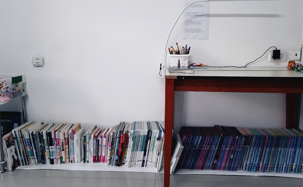 아이들 책이 계속 늘고 있다. 책장을 따로 사지 않고 현재 집에 있는 가구와 환경을 최대한 활용하여 가급적 깔끔하게 정리하고자 고민하고 실천하고 있다. 가장 최근에는 책을 바닥에 쭈욱 꽂아서 진열하여 정리를 했다. 양 옆으로 책을 지지할 수 있는 벽, 책상다리 및 소가구를 이용하여 책을 세우니 넘어가지 않고 많은 책을 다 수용할 수 있다. 아직 아이들이 어려 바닥에 앉거나 누워서 노는데 아이들 눈높이에 맞으니 놀다가도 바로 눈에 들어오는 책을 가볍게 꺼내 읽는다.