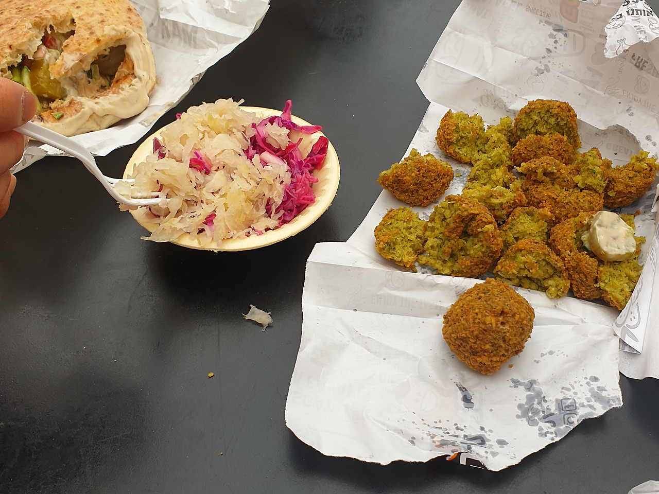 각종야채에 병아리콩으로 만든 소스인 후무스 그리고 병아리콩으로 완자를 빚어 튀겨낸 팔라페를 피타빵 안에 넣어서 줍니다.