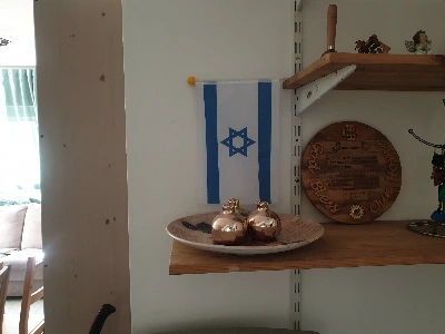 현관 입구에서 이스라엘 국기가 맞아주고