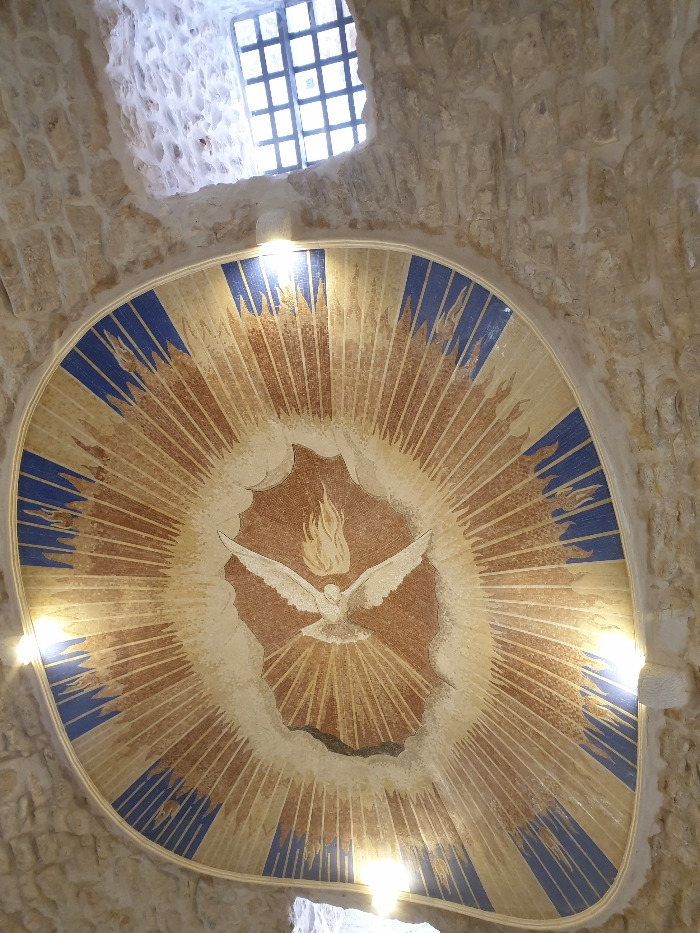 천장에는 성령님을 상징하는 흰비둘기 그림이 모자이크로 표현되어 있습니다. 가만히 올려다보고 있으면 부드러운 색감과 따뜻한 빛으로 마음도 편안해집니다.