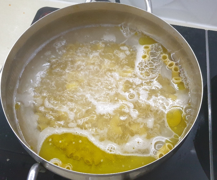먼저 적절한 냄비에 적당량의 물과 소금, 올리브유를 붓고 끓인다.