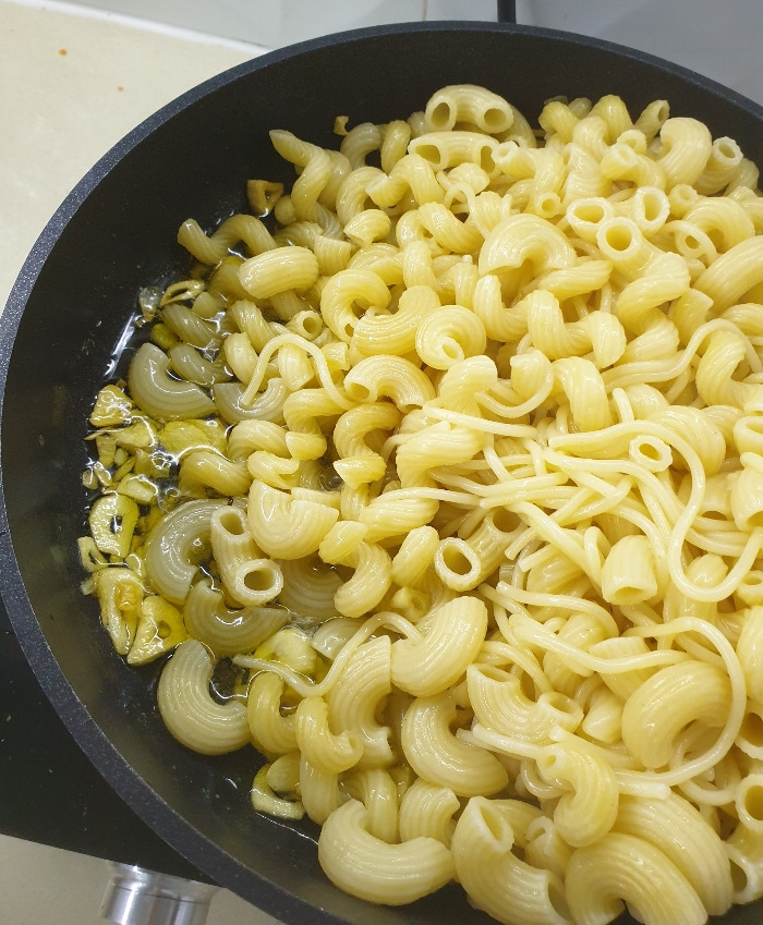 이제 다 익은 마카로니와 마늘 올리브유 소스를 한데 섞어준다. 혹시 삶은 물이 남았다면 간을 맞추면서 조금 섞어주어도 좋을 것 같다.