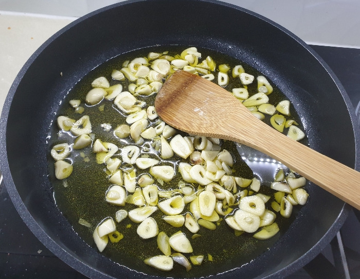 올리브유에 튀겨지듯 익은 마늘은 이후 파스타위에 토핑처럼 올리면 좋다.