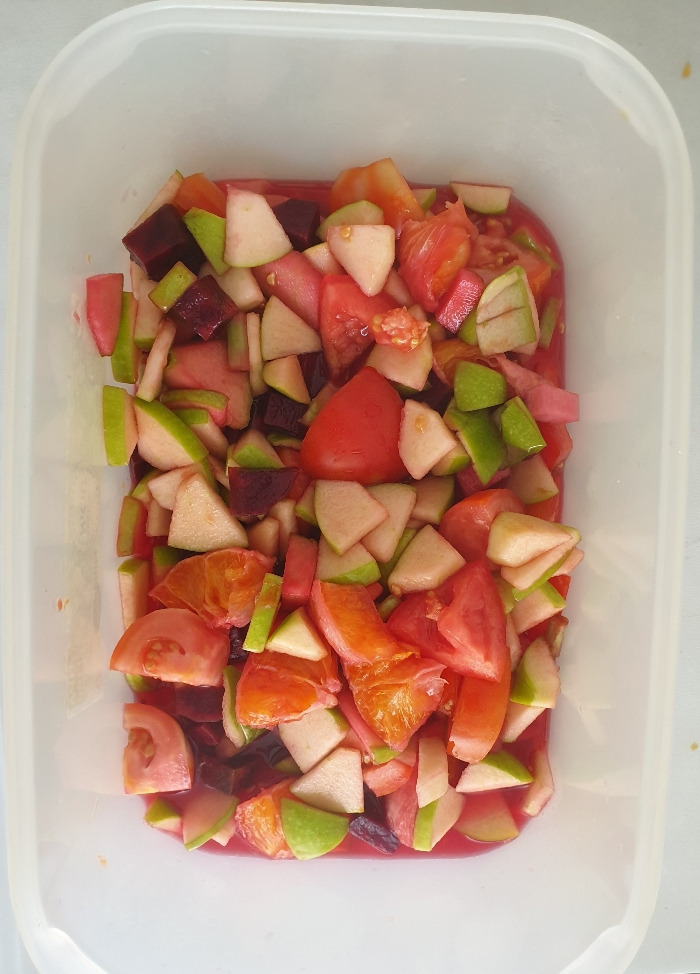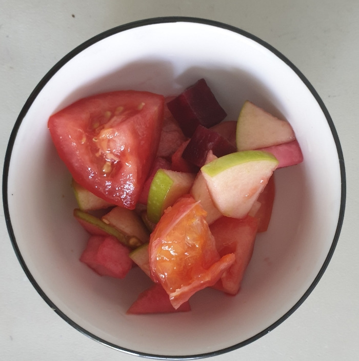 토마토 사과 그리고 비트를 먹기좋게 썰어서 통에 넣고