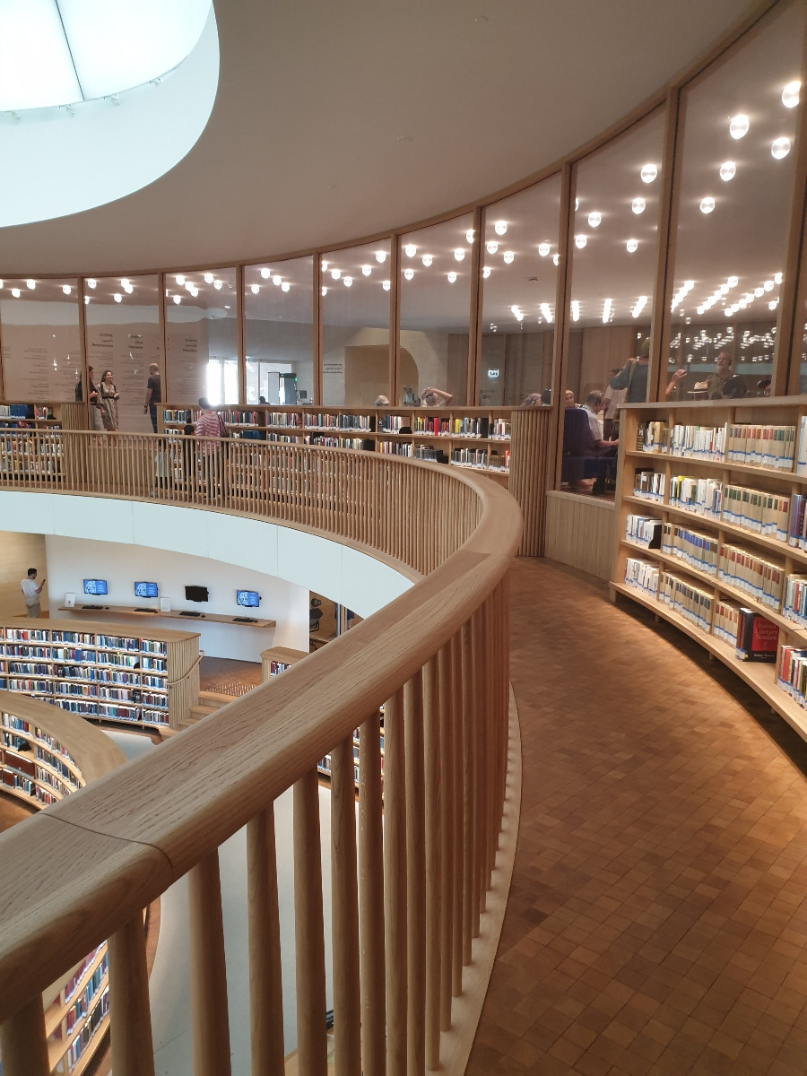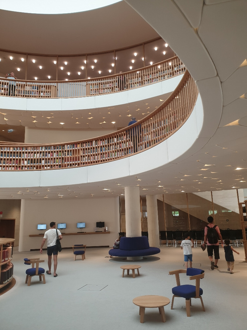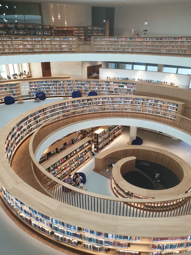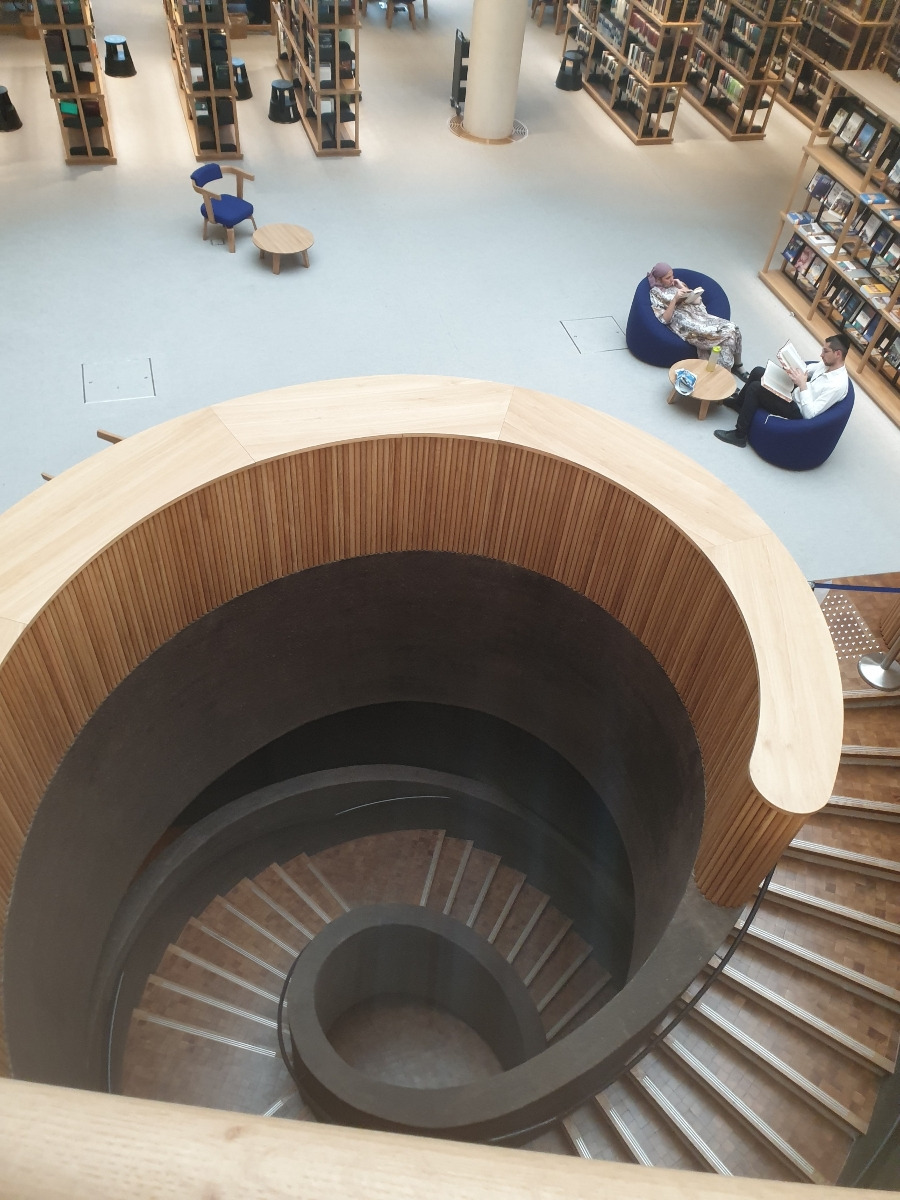 나선의 계단으로 4층 높이가 다 이어져있다. 위에서 아래를 내려다보면 마치 책의 바다 속을 유영하는 듯 하다.