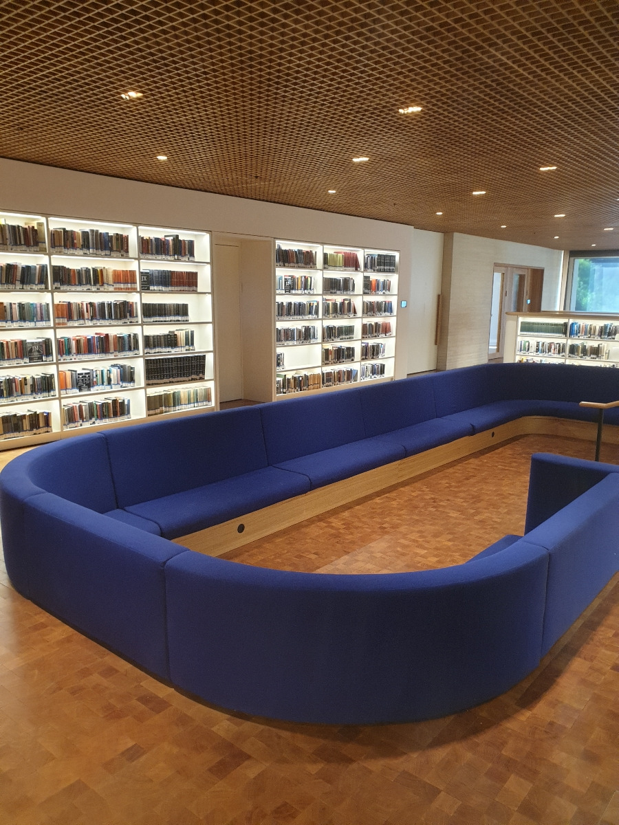 진한 파랑으로 덮힌 긴 소파와 밝은 빛으로 가득한 책장.