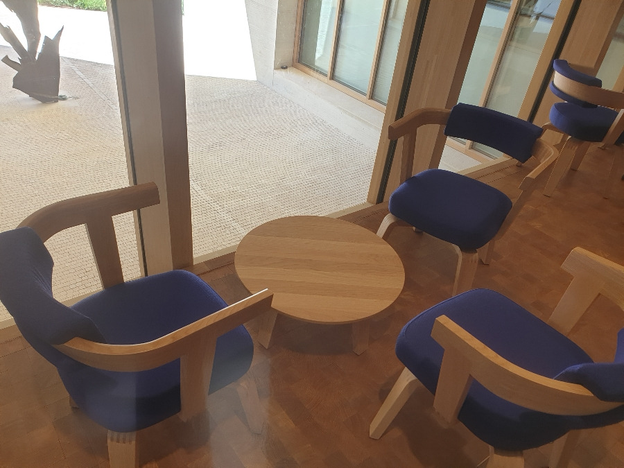 원형 미니 테이블과 열람데스크의 사각 디자인이