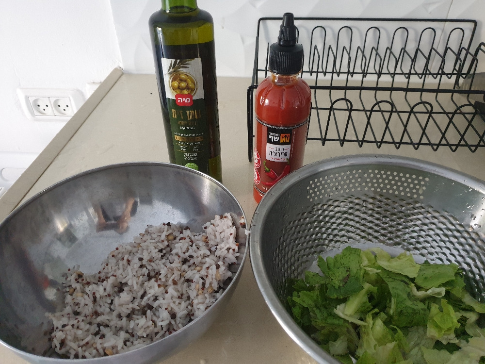 갓 지은 잡곡밥에 상추 세 장 깨끗히 씻어 손으로 잘게 찢어 올린다.