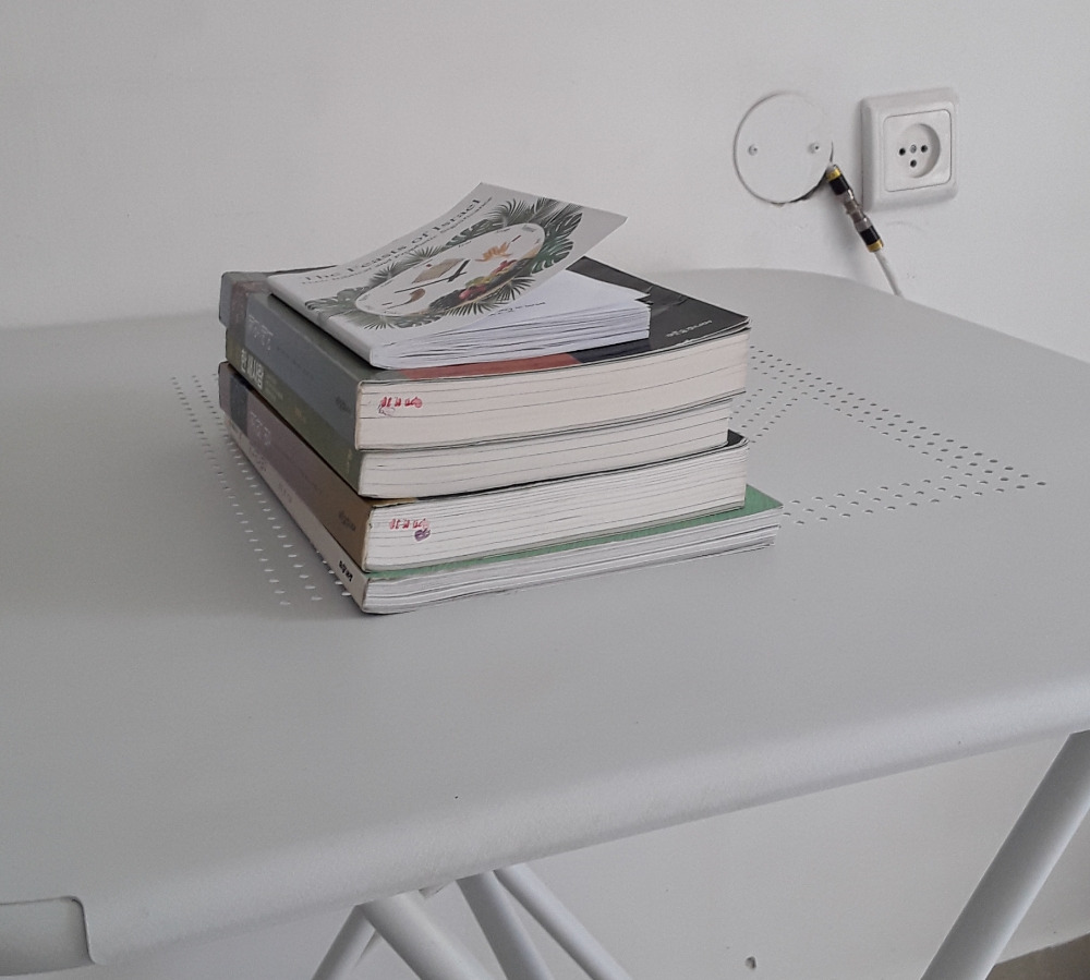 캠핑테이블을 책장 으로도 쓴다. 벽에 붙인 후 책들을 가지런히 꽂고 맞은편 가장자리에는 무거운 프린터로 책을 고정해두었다. 양 끝만 잘 고정해서 책을 꽂으면 꽤 많은 양의 책들도 쓰러지지 않게 비치가 가능하다.