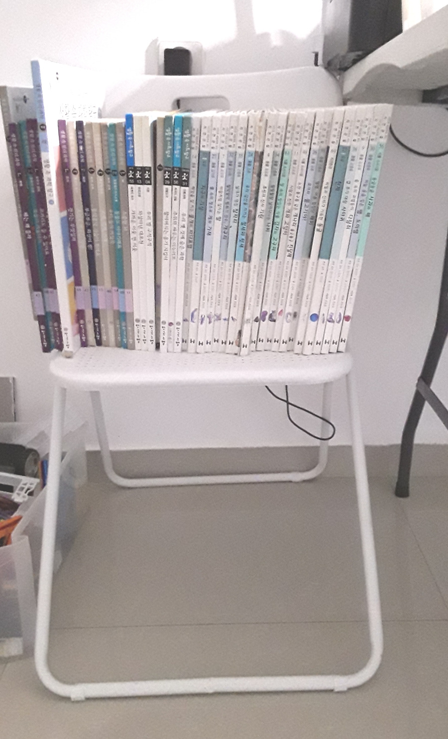 철제의자를 남편이 작업한다고 밟고 올라갔다가 좌석 부분이 살짝 내려앉았다. 아래로 쏠림이 있어 사람이 앉기에는 불편해도 물건을 올려 쓰기에는 괜찮아 보여 아이들 책을 꽂아 책장으로 쓰고 있다. 양옆으로 지지가 잘 되어 책이 쓰러지지 않고 모양도 심플해서 작은 책장으로 잘 쓰고있다.