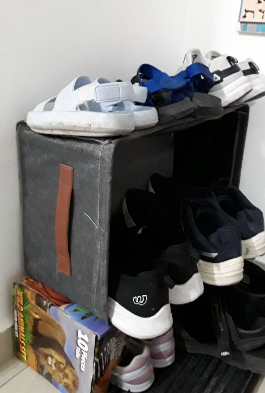 아이들 완구 포장지였던 단단한 종이박스와 구매 후 이런 저런 용도로 쓰긴했지만 부직포 재질로 낡고 헤어져서 더 이상 사용하기가 어렵다고 여겼던 수납함을 이용하여 삼단 신발장을 만들었다.