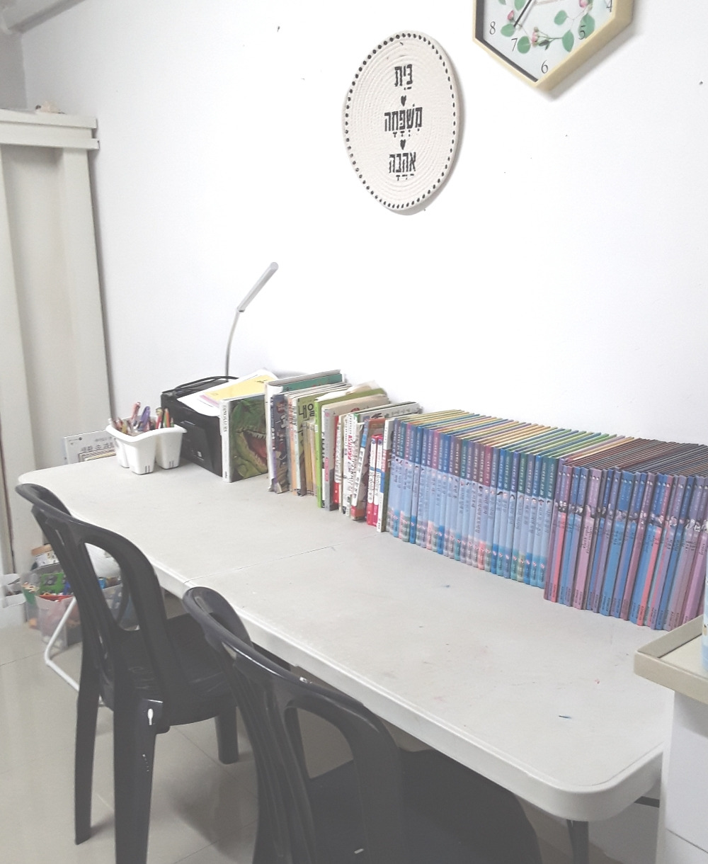 이전에는 놀이방 매트에 눕거나 바닥에 턱을 괴고 앉아서 책을 읽었다. 허리며 눈에도 무리가 갈테고 좋지않은 독서 자세가 굳어질까 염려되기도 했는데 책을 테이블 위에 두니 자연스럽게 아이들이 의자에 앉아 책을 본다.
