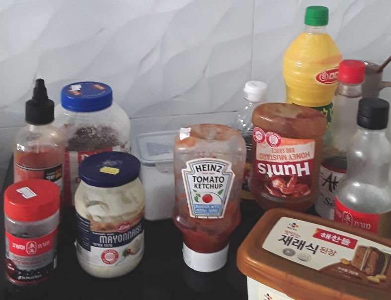여기에 아이들 반찬 만들때 쓰는 케첩, 마요네즈, 치킨소스 그리고 참깨가 함께 한다.