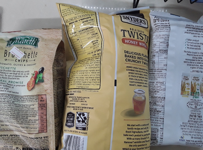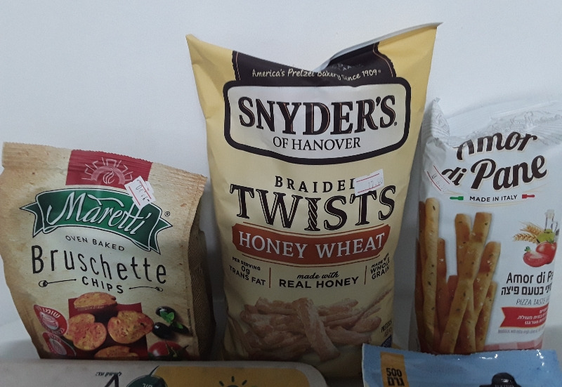 아이들 과자. 통밀 허니 프리첼, 토마토 올리브 오일 맛이 가미된 칩, 토마토 파스타 맛이 나는 스틱.