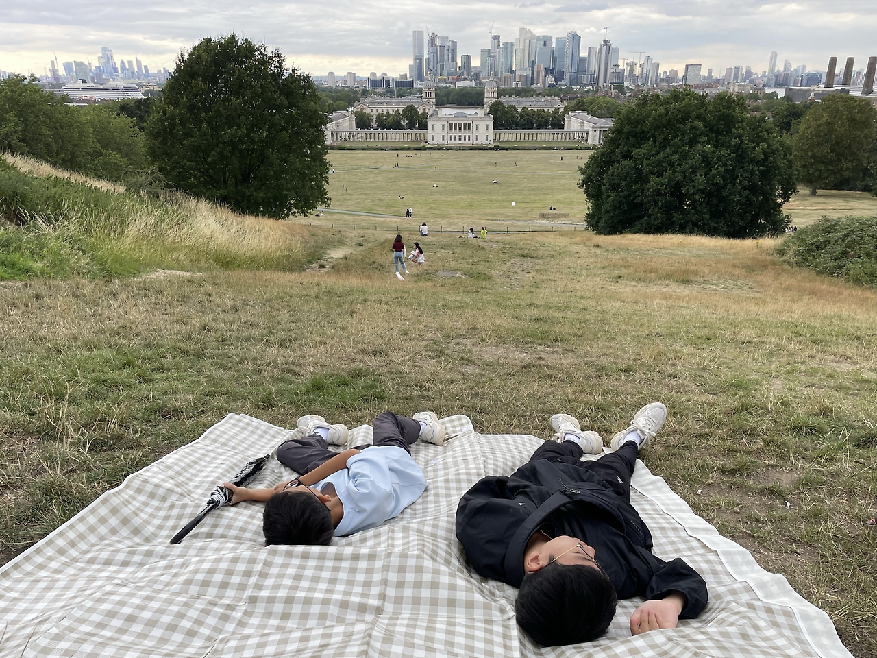 그리니치에서 아이들과 남편은 천문대 관람을 보내고 본초자오선에 큰 관심이 없는 나는 그리니치 파크를 돌아보기로 했다. 그리니치 천문대는 그리니치 파크에서도 언덕 위에 있어 템즈강까지 내려다볼 수 있는 경관이 좋은 위치에 있었다. 가져온 돗자리를 깔고 커피 트럭에서 라테를 한 잔 사들고 앉았다. 집을 떠나 처음으로 혼자 있는 시간이었다. 흐린 날이었지만, 하늘에 떠다니는 구름과 사진 찍는 사람들, 피크닉을 즐기는 연인들, 가족들, 산책을 즐기는 개들, 그리고 거기에 내가 앉아 있었다. 피로가 겹치기도 했지만 다소 몽롱한 상태였던 나의 상황 때문인지 그 시간이 비현실적으로 몽환적이었다. 평화롭고도 고요해지던 그 시간이 얼마쯤 지났을까. 관람을 마친 남편과 아이들이 나에게 왔다. 잠깐 떨어져 있었을 뿐이었건만 둘째 아이는 나에게 달려와주었고 이내 돗자리에 덜렁 누워버린다. 조류공포가 있는 우리 큰 애도 비둘기들을 피해 조심히 내 옆에 앉는다. 아이들 데리고 관람과 사진 촬영에 심혈을 기울였을 남편이 심심하지 않았냐며 내게 물으며 돗자리에 들어선다.