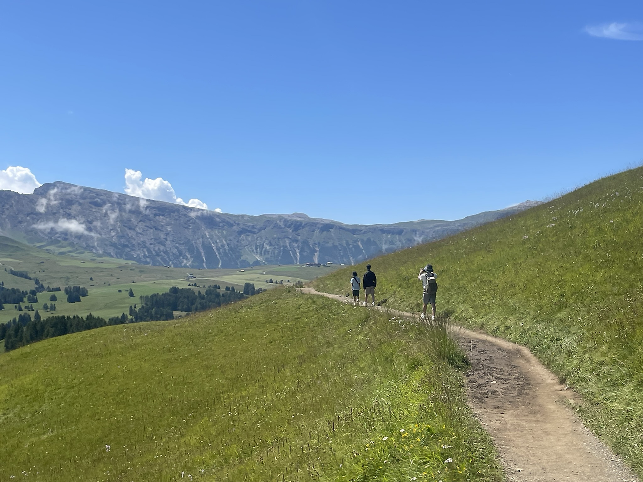 푸릇푸릇한 평원과 저 멀리 높이 솟은 바위산이 병풍처럼 펼쳐져 있는데 처음 보는 풍광에 넋을 잃고 감탄만 하며 한참을 바라보았다. 아이들도 멋진 산세에 감탄하여 이제 걸어보자는 제안에 흔쾌히 따라준다. ‘알페디 시우시’는 사실 트래킹 난이도가 하에 가까운 곳이라 실제로는 어린 아기를 동반한 등산객들도 많았다. 그만큼 평탄하고 풍경이 목가적이고 아름다웠다.