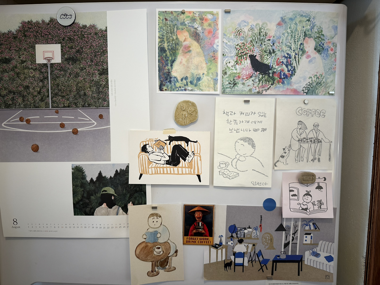 해야 할 공적인 일들을 마치자 이제는 집안일들이 기다리고 있었다. 사실 주부인 나에게 방학은 유예된 휴식만 하는 기간이 아니라 유예된 집안일들도 기다리는 때이다. 미뤄두기만 했던 책장 정리 때문에 책장 근처에 새로 산 책이 쌓이고 있었다. 서랍장에는 받은 엽서와 새 엽서가 뒤섞여버렸다. 아이들의 옷장은 하의 칸과 상의 칸이 뒤섞여 대 혼돈의 상태였고 우리 옷장에도 여전히 긴팔 옷 몇 벌이 여름옷들과 함께 섞여 있었다. 주방은 어떤가.... 더 이상 쓰지 않겠다. 문을 열 때마다 정리를 외치던 서랍장들과 옷장과 책장을 정리하고 나니 이제 정말 개학이 코앞이다.