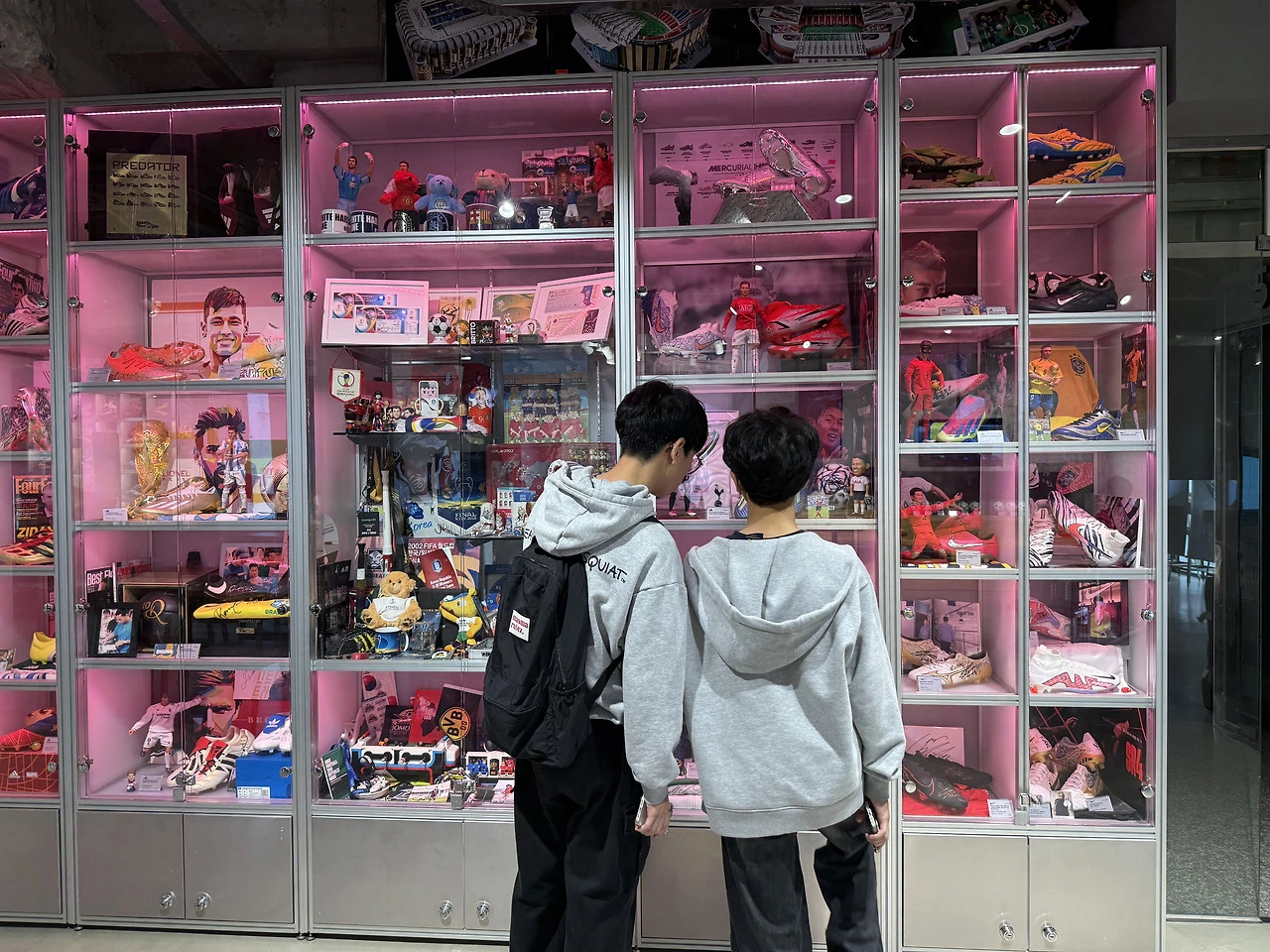 그렇게 동대문 근처의 축구 용품 샵에 가보니 무려 4층짜리 건물에 빼곡하게 축구용품이 차곡히 채워져 있다. 한 층은 유니폼만, 또 한 층은 브랜드별로 나오는 축구화만... 사람들은 보통 1~3층에서 구경하는데 우리는 먼저 훑어본 막내가 위로 올라가야 진짜라기에 4층까지 올라갔다. 1~2층이 축구 가게라면 4층은 그야말로 올라가면 올라갈수록 마니아들의 공간이자 박물관이었다. 가장 마지막 층은 축구 용품샵의 주인이 그동안 모아놓은 축구 용품들이 전시되어 있었다. 사인받은 축구화, 유니폼, 본인이 사다 모은 각종 축구 관련 굿즈들. 족히 10년은 넘게 모았을 것들이 유리 상자 안에 소중하게 들어있었다. 나는 죄다 모르는 선수였지만 막내는 연신 사진을 찍고, 이리저리 둘러보며 아주 신났다. 그런 둘째에게 큰애가 또 홍대 쪽에 있는 빈티지샵에 가보자고 한다. 원래 홍대 근처에 있는 연필 샵에 가려고 했던 우리였다. 문구에는 별다른 관심이 없는 동생이기에 동생이 좋아하는 축구 유니폼 빈티지샵에 들렀다 연필을 사러 가자는 것이다. 축구 흥분모드에 접어든 둘째는 말하지 않았는데도 가는 길을 검색해 본다.