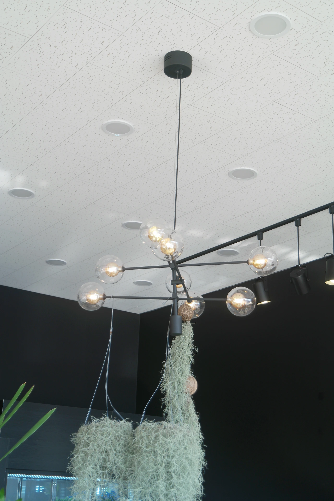 프롬 안으로 들어서면, 가장 먼저 모빌을 닮은 독특한 구조감이 돋보이는 펜던트 조명이 시선을 집중시킵니다. 조명 본연의 빛을 비추는 기능과 더불어 인테리어 소품으로서의 기능을 담당하는 포인트 역할은 물론, 덩굴 식물을 매달아 행잉 가드닝의 한 부분으로 연출되도록 하였습니다.