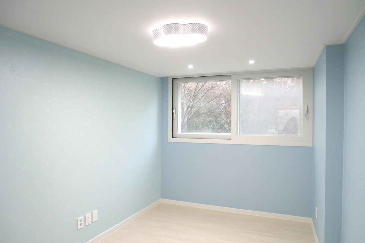 리모델링 시 넓고 깔끔한 인테리어 콘셉트에 맞추기 위해 발코니 부분을 확장하고, 하늘색 벽지를 사용하여 스트레스를 줄여주는 차분한 분위기를 연출했습니다.